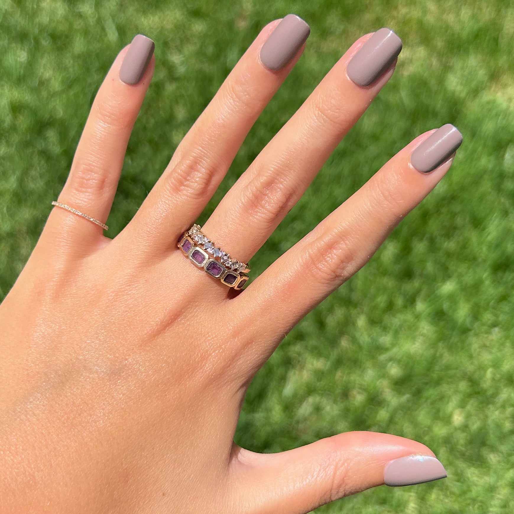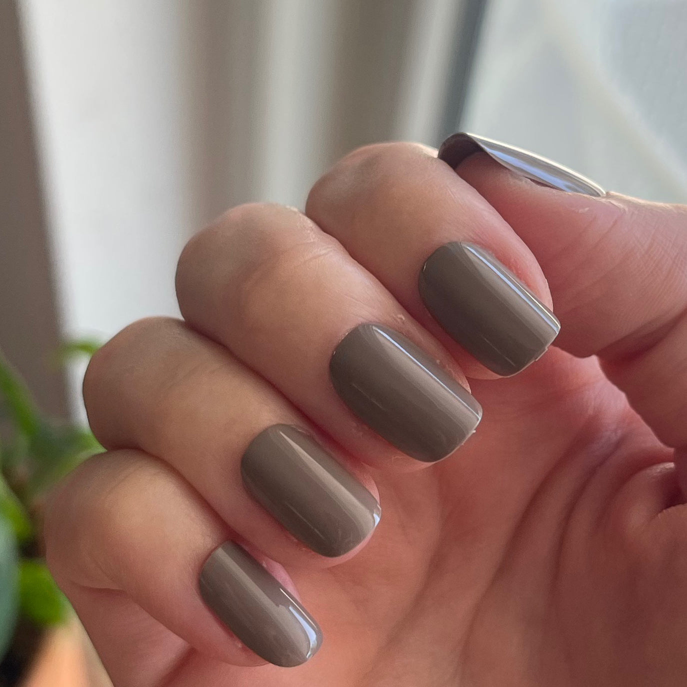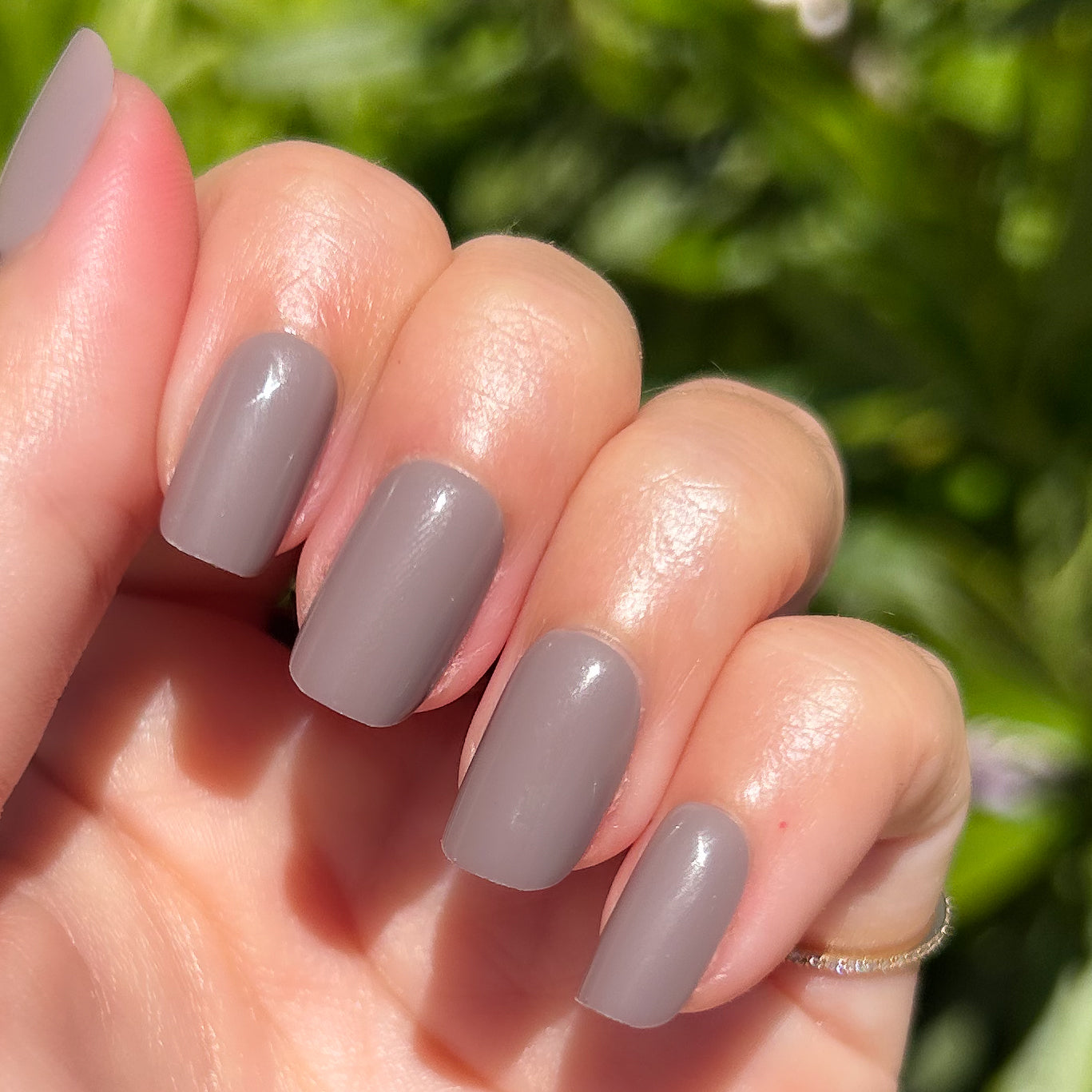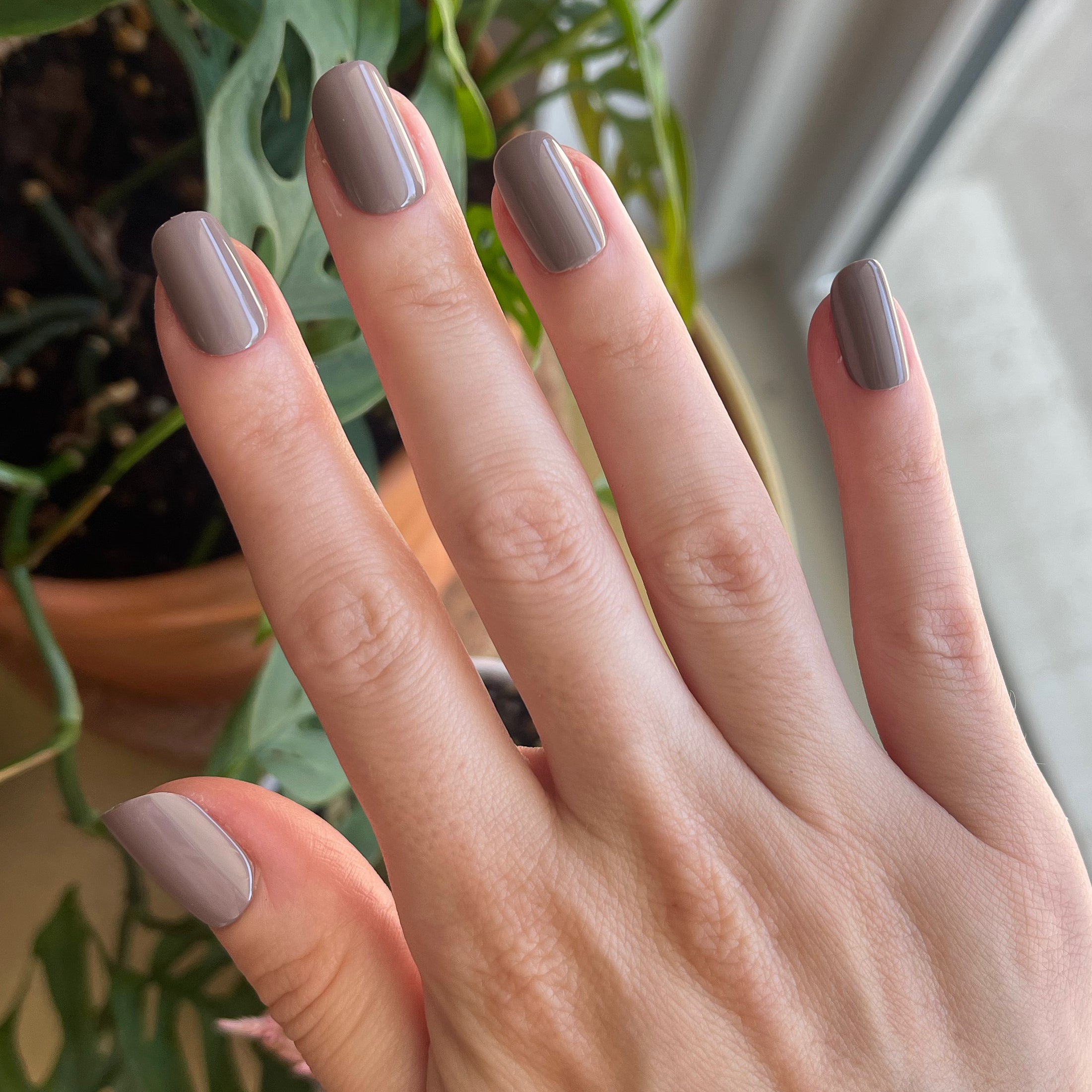 A warm-toned grey in a short squoval shape for when your mani wants to play it cool.