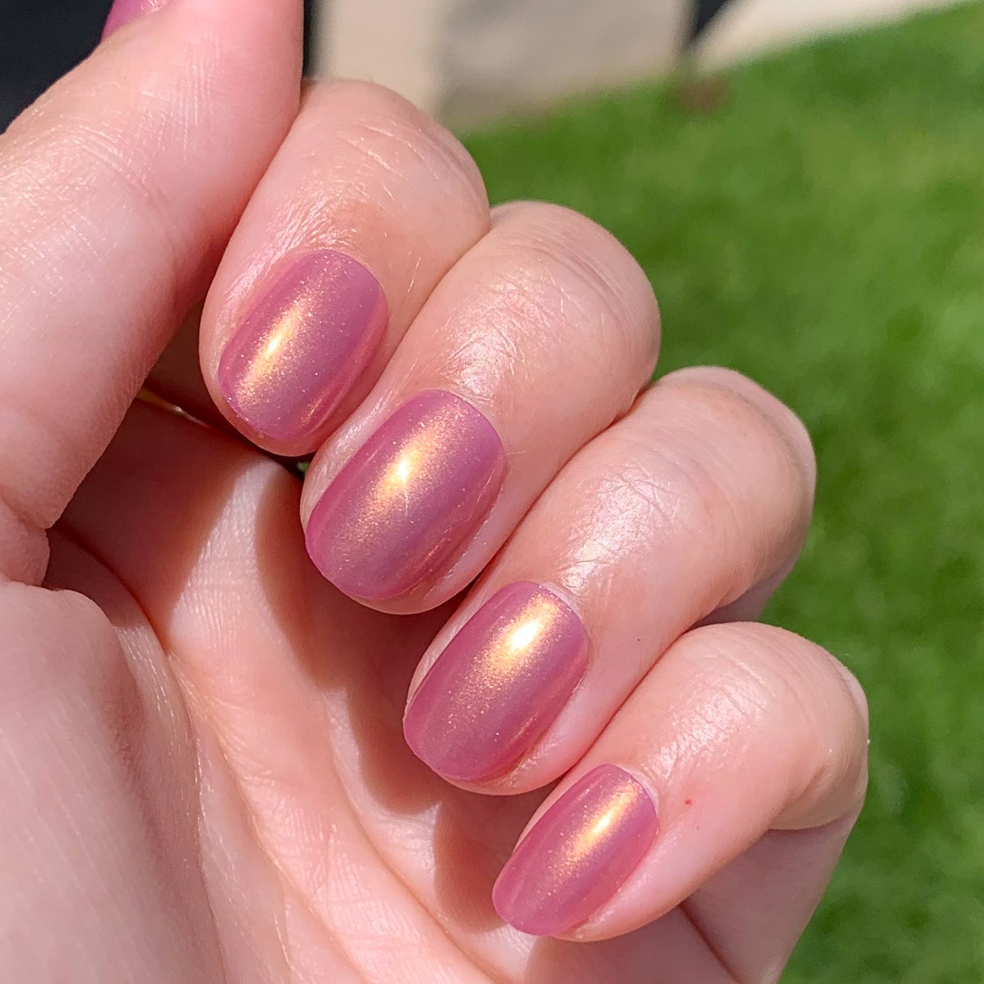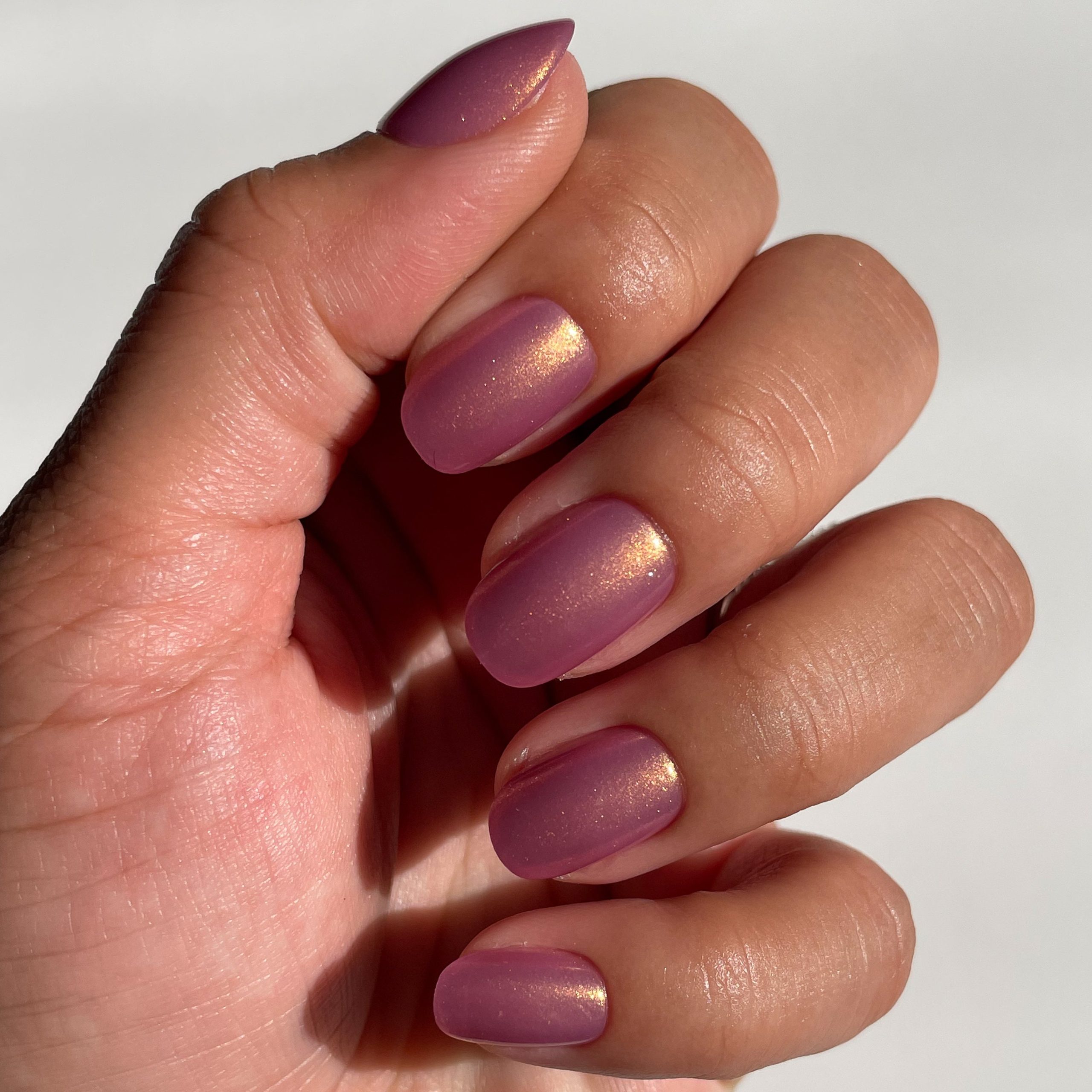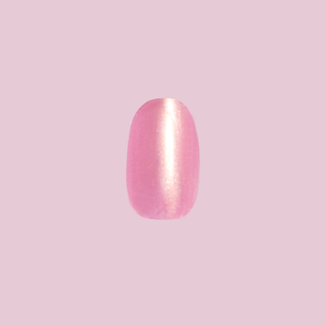 A coral iridescent mani in an extra short round shape.