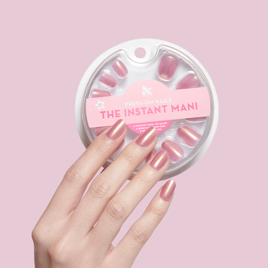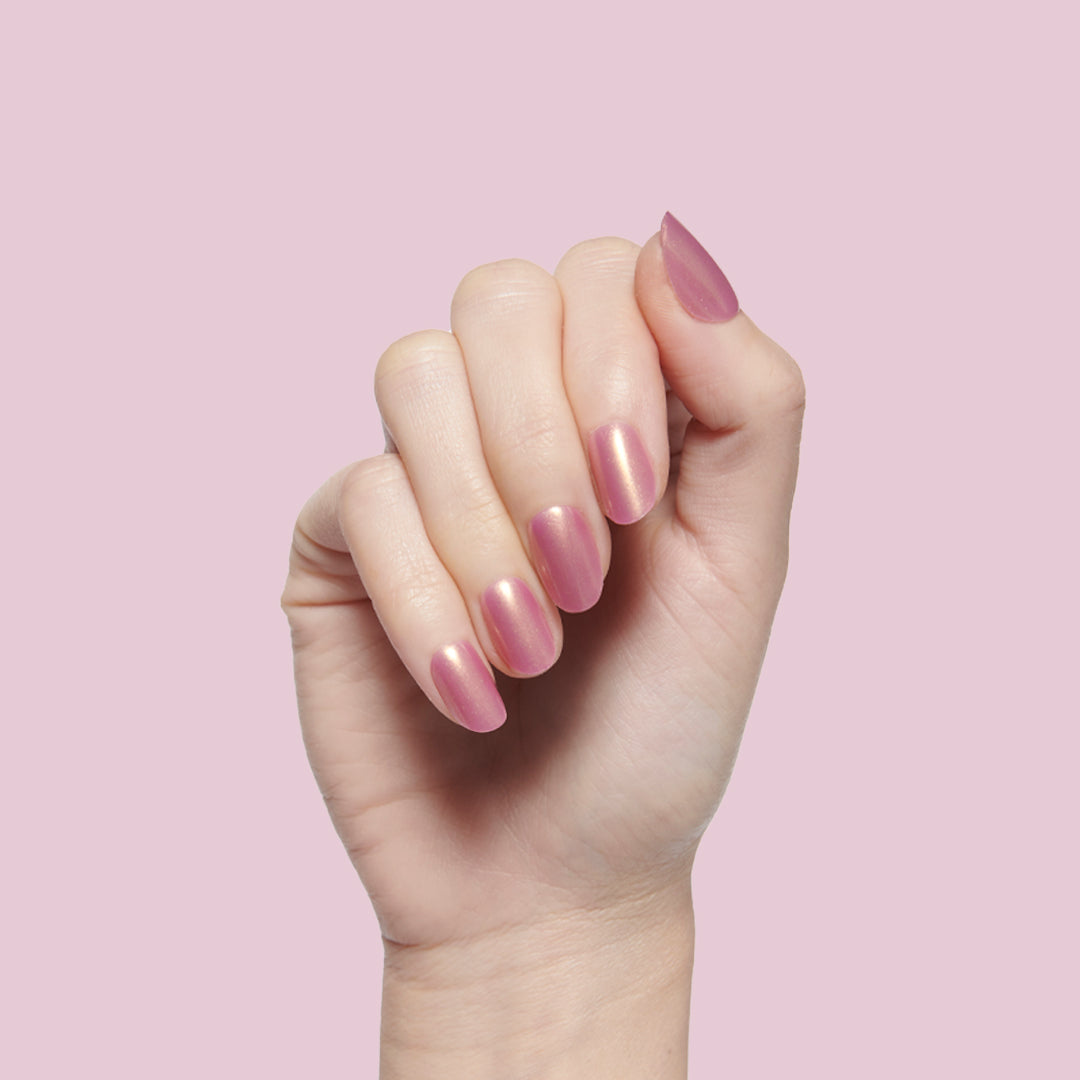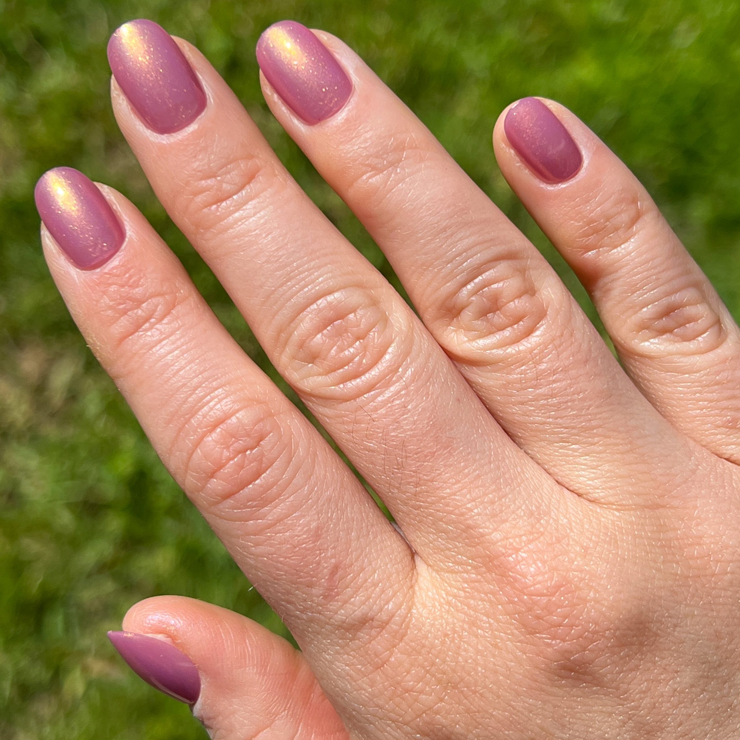 A coral iridescent mani in an extra short round shape.