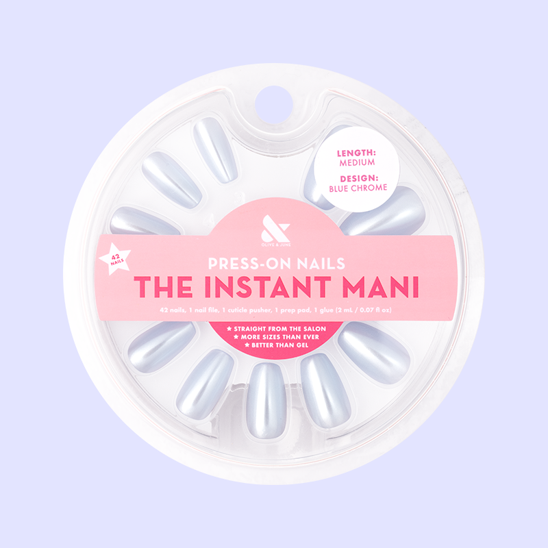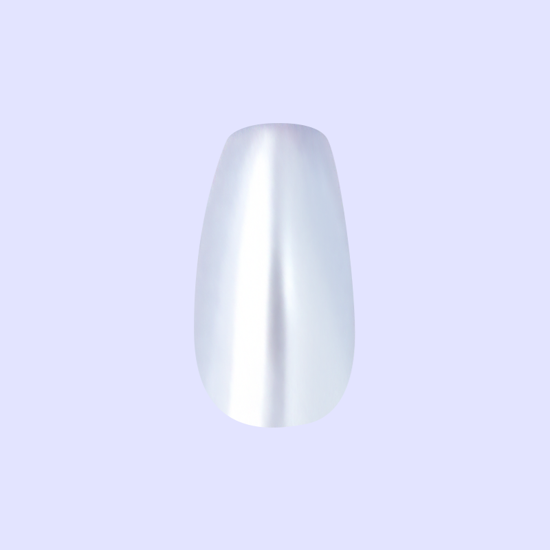 A pastel blue chrome manicure in a medium coffin shape.