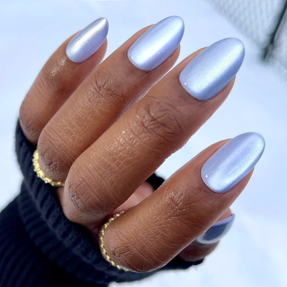 An ultra light pastel blue with a magnetic velvet effect in a medium oval shape.