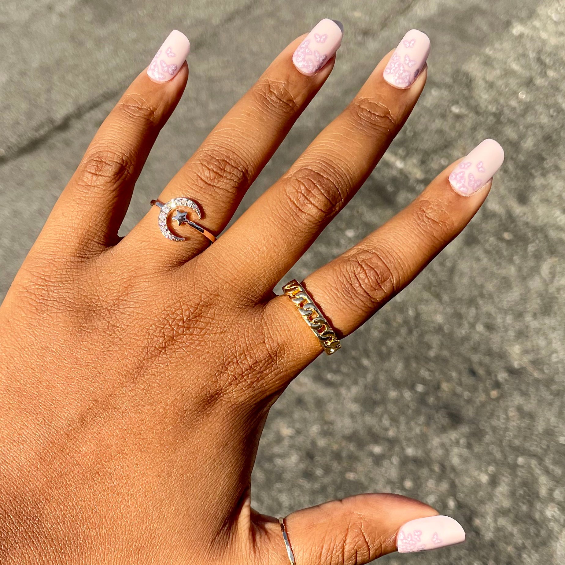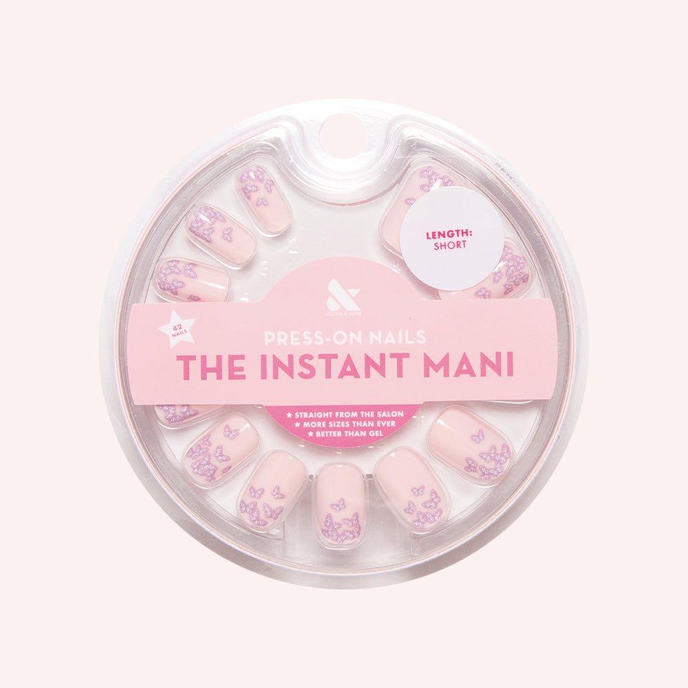 A magical mariposa ombre of lavender butterflies in a short squoval shape.