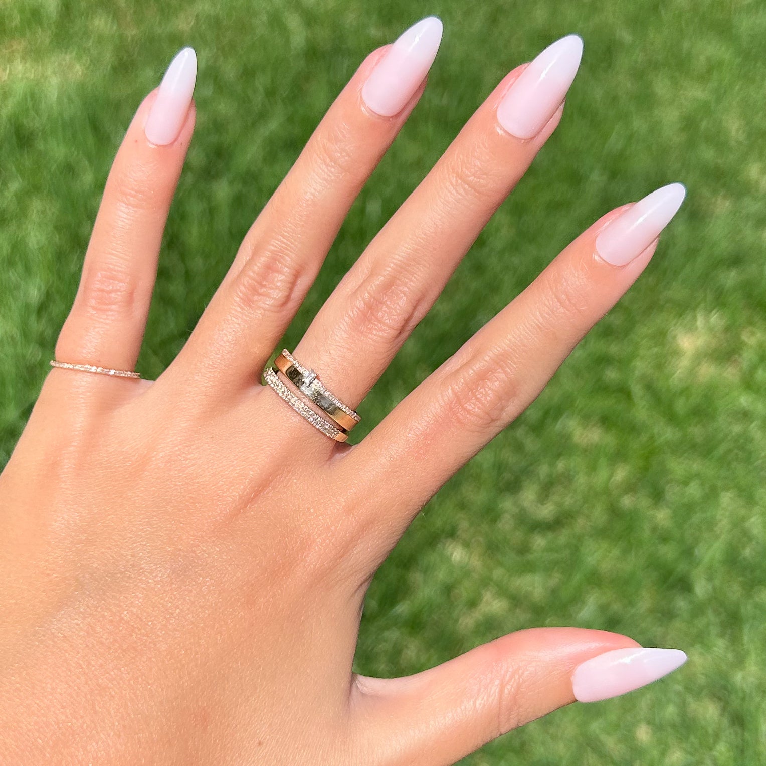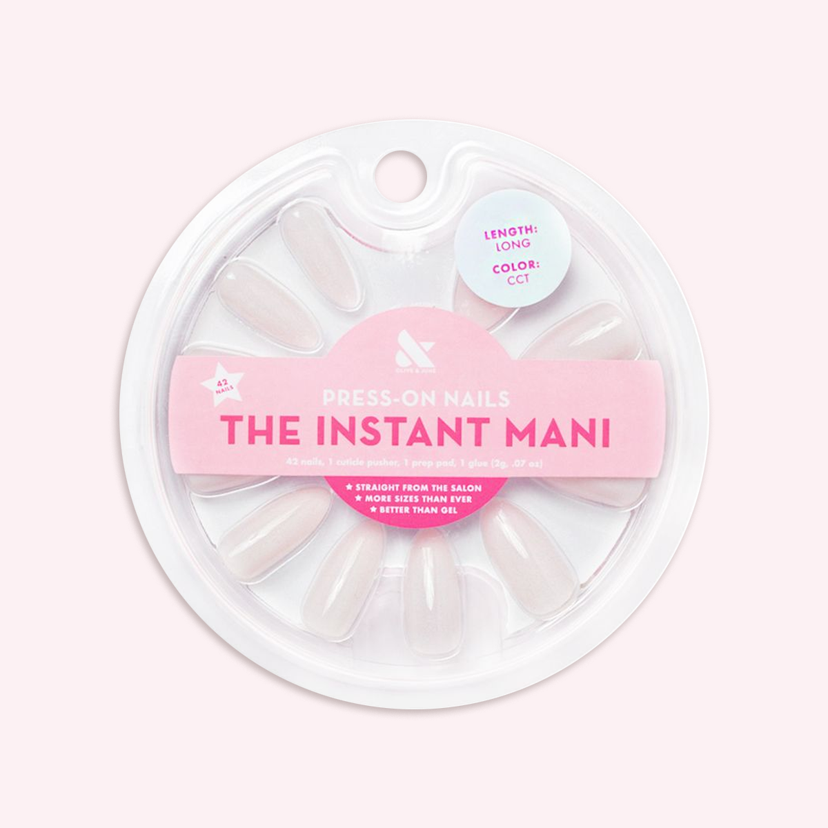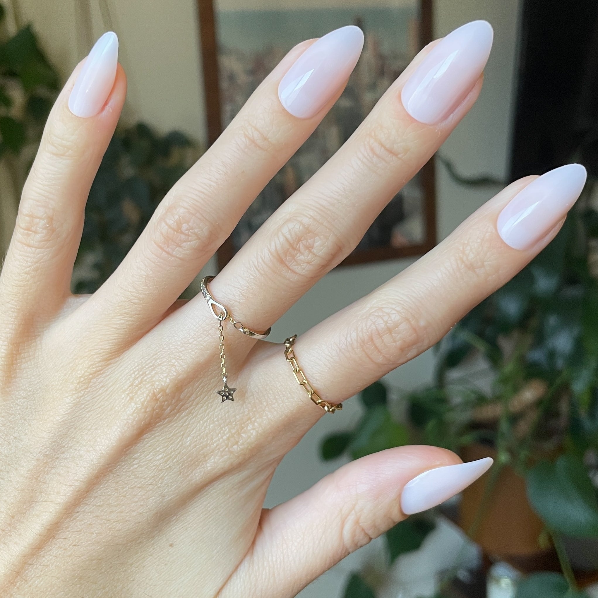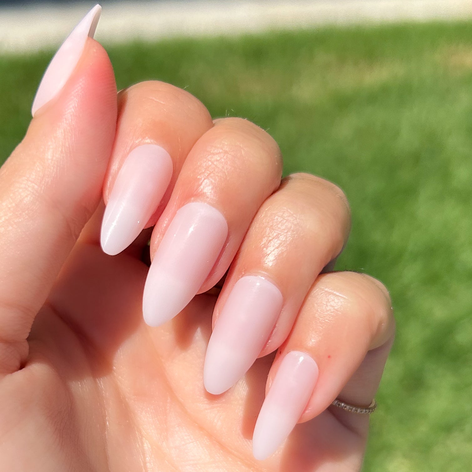 A sheer pink that makes a soft. feminine statement in a long almond shape.
