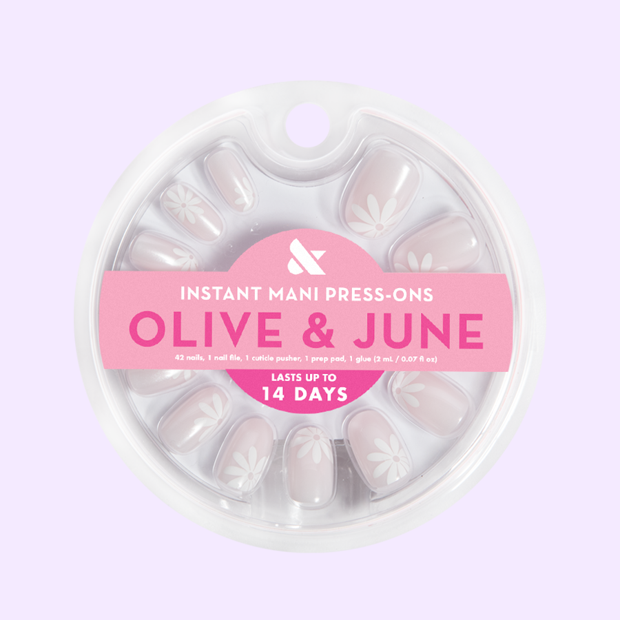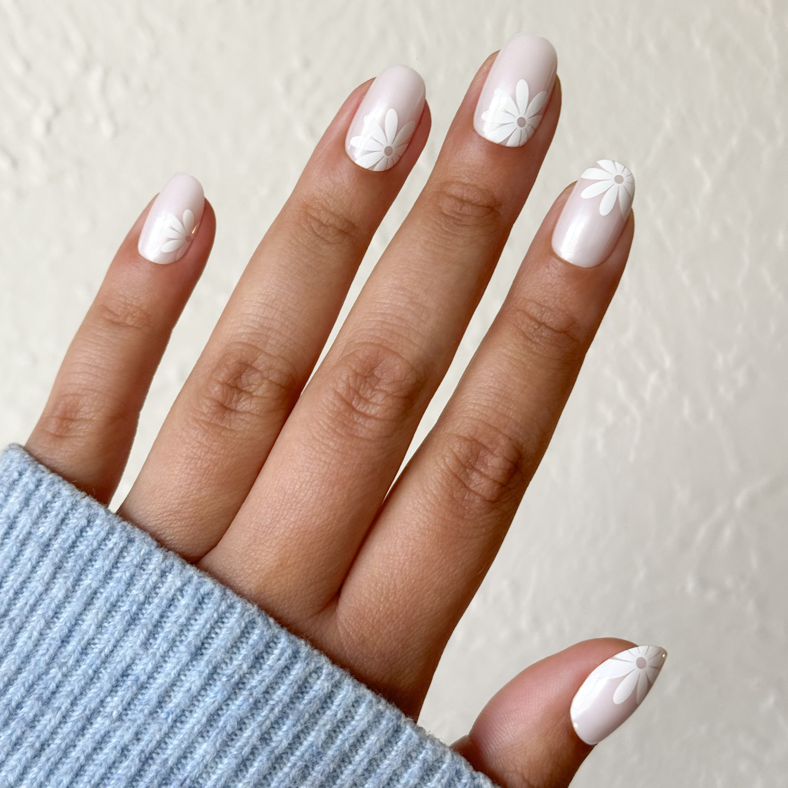 A neutral mani accented by big daisies with a shimmery chrome finish in a short round shape.