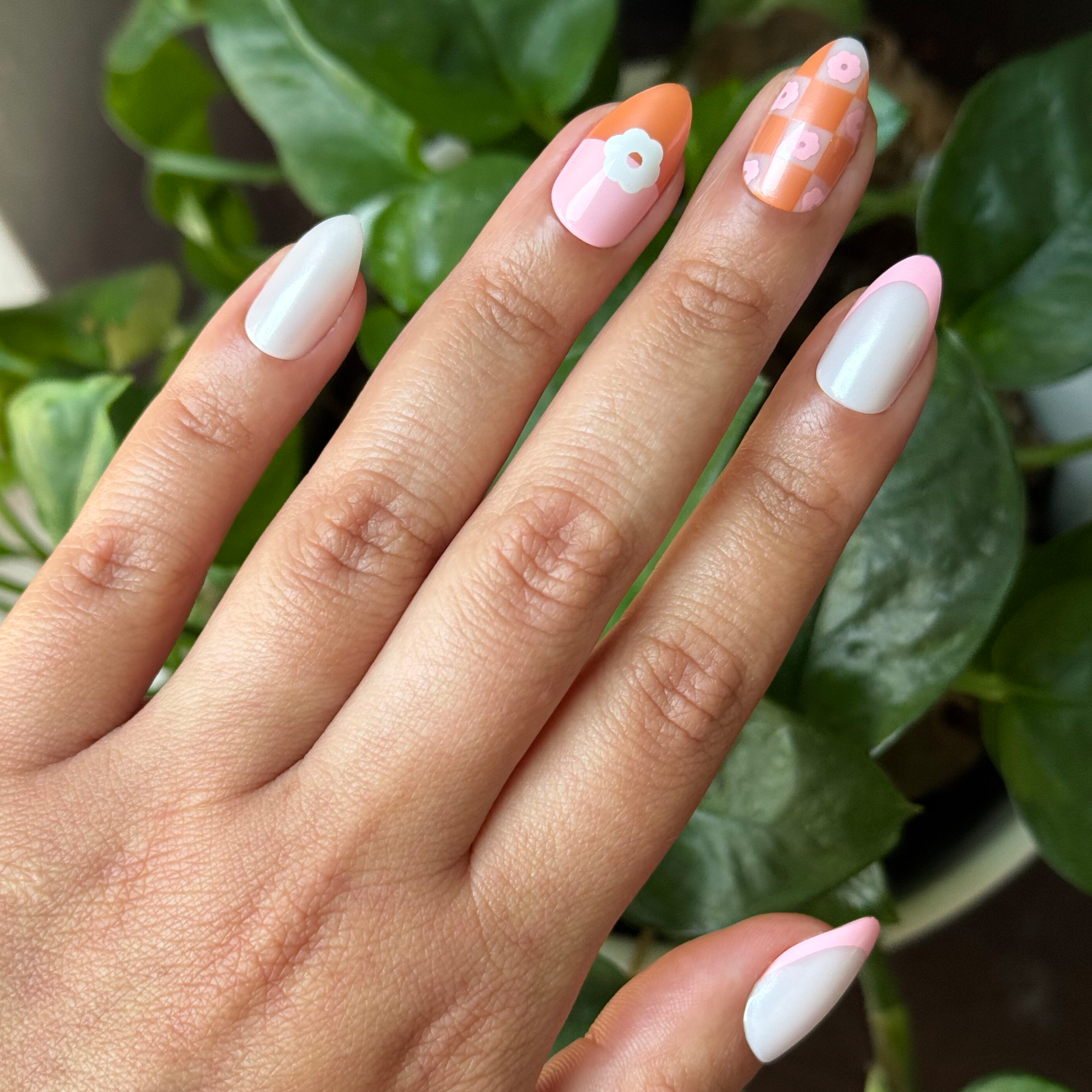 A fabulously floral mixed pack of frenches. prints and solids topped with chrome in a medium almond shape.