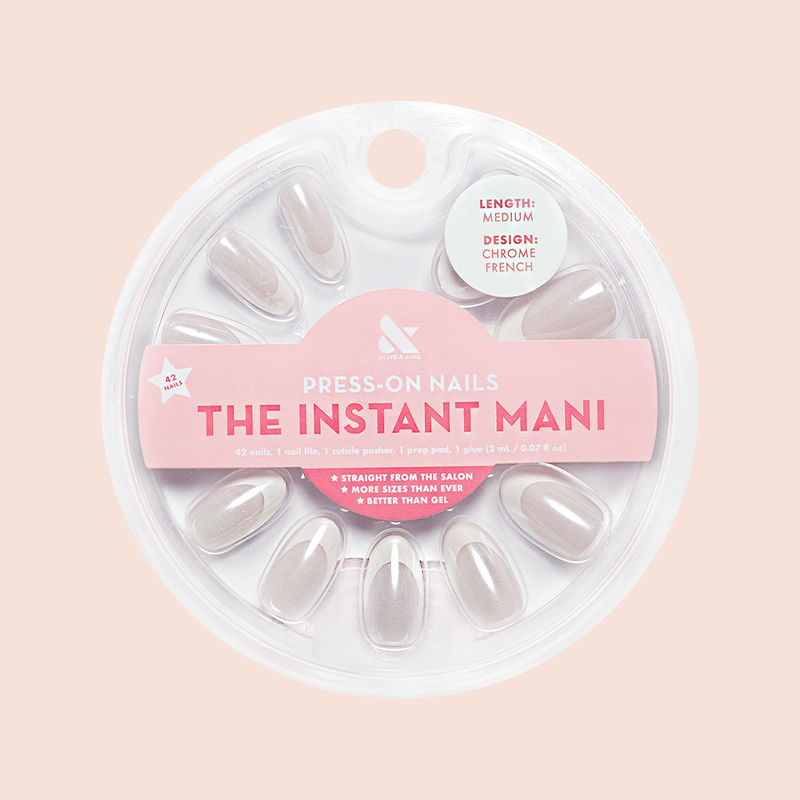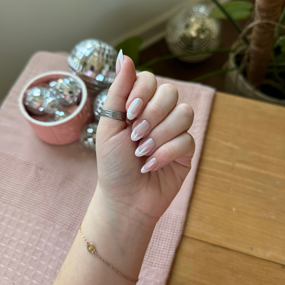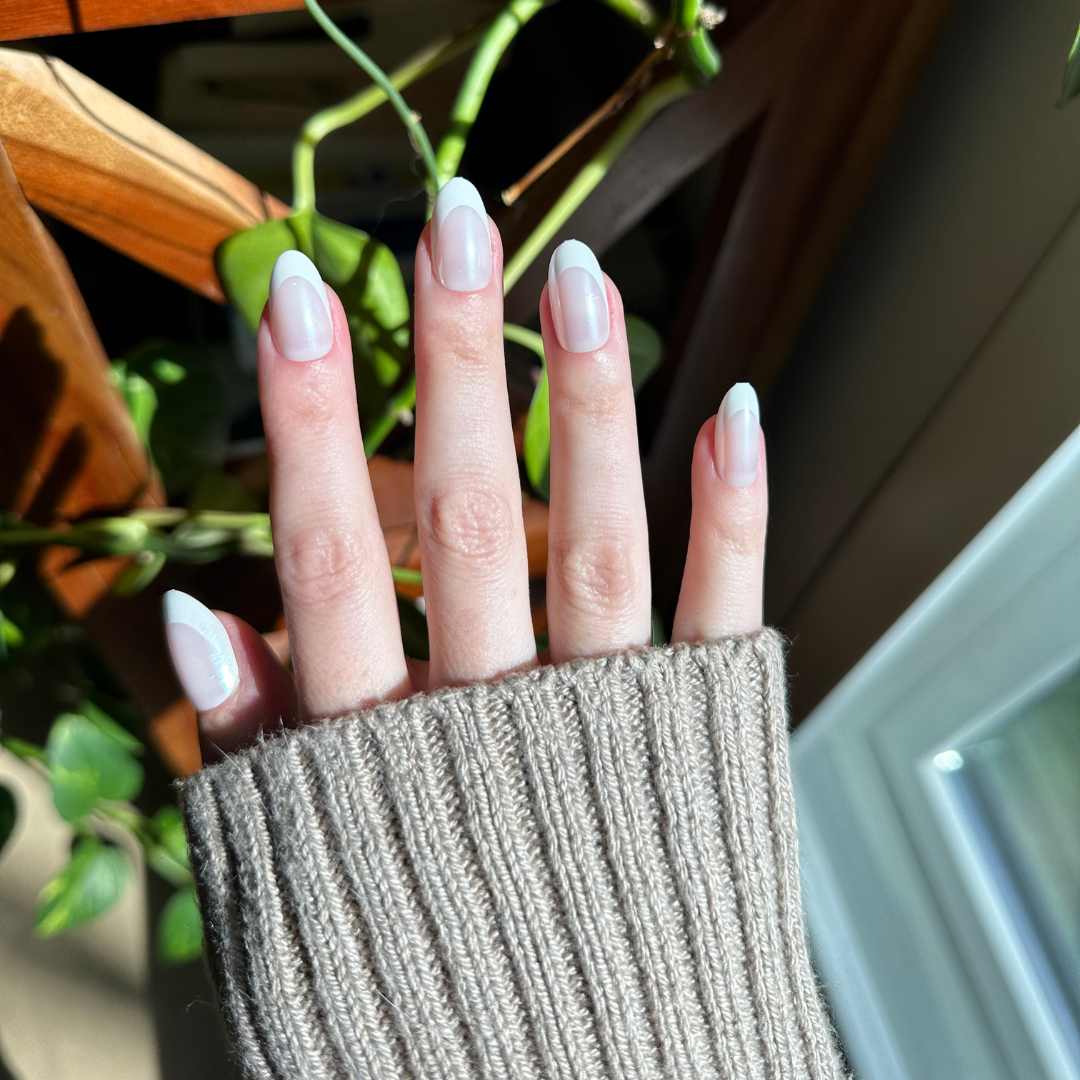 A classic thick french mani topped with shimmering chrome in a medium oval shape.
