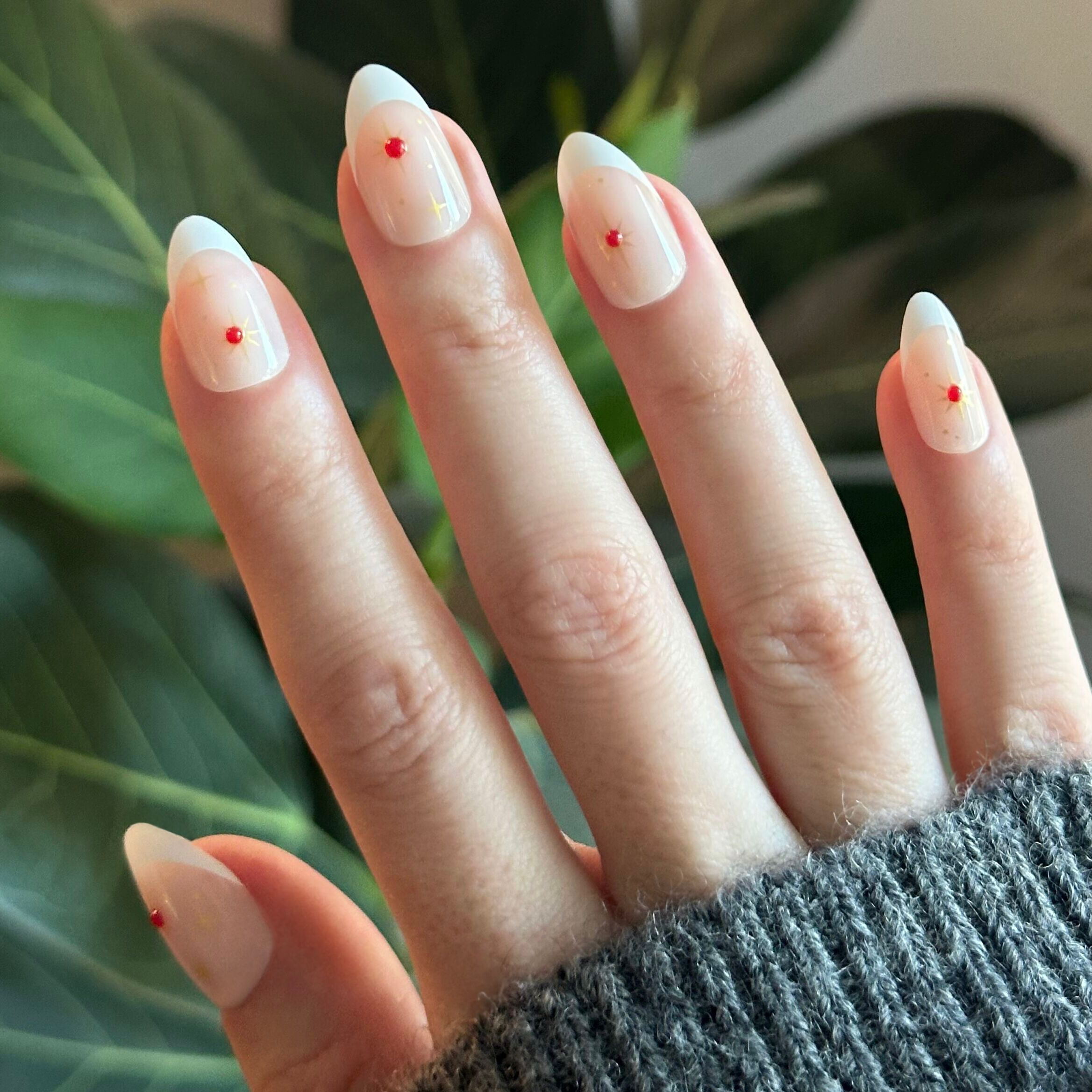 A classic french tip mani accented with 3D puffy red gems and gold sparkles in a medium almond shape.