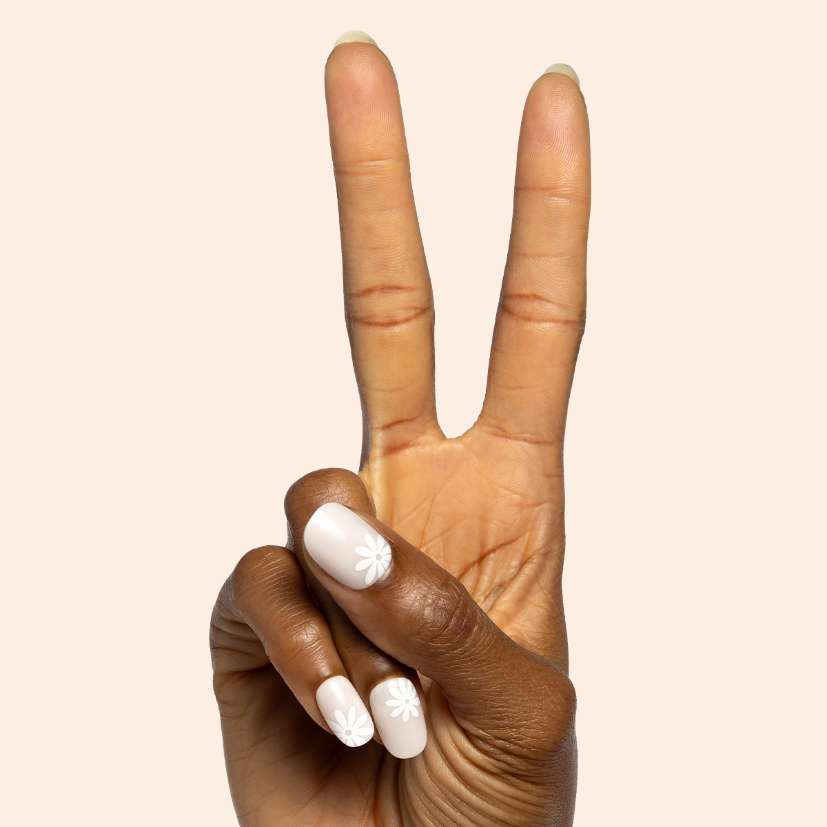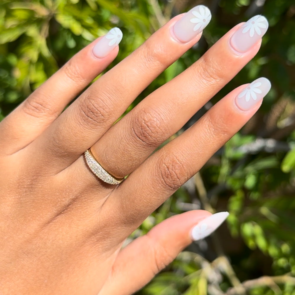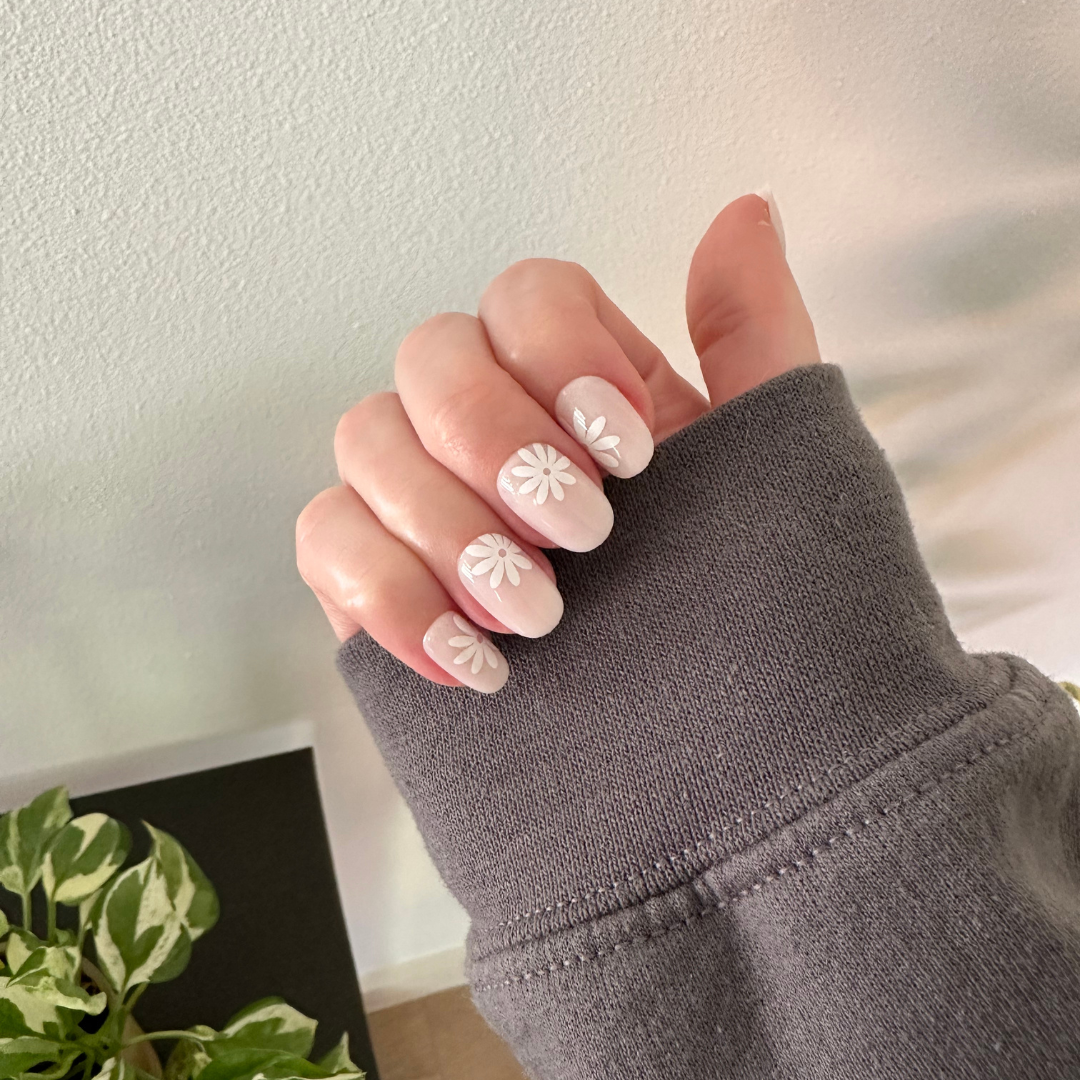 A neutral mani accented by big daisies.