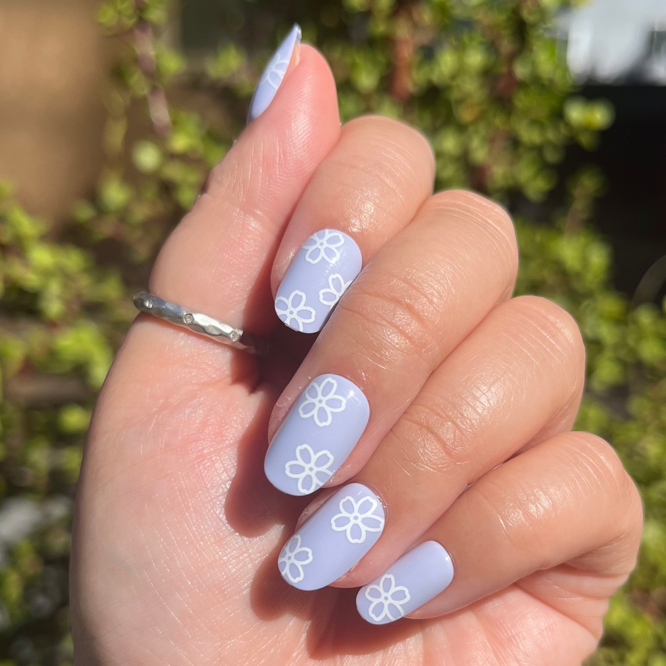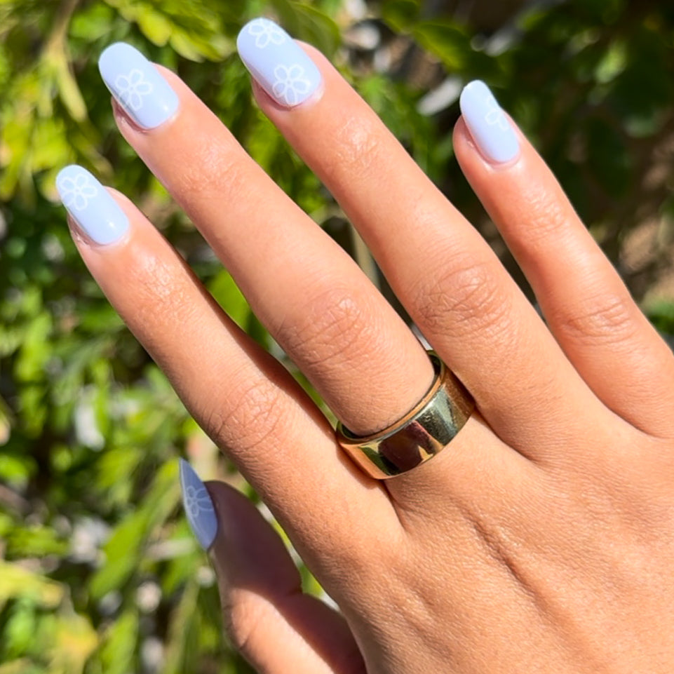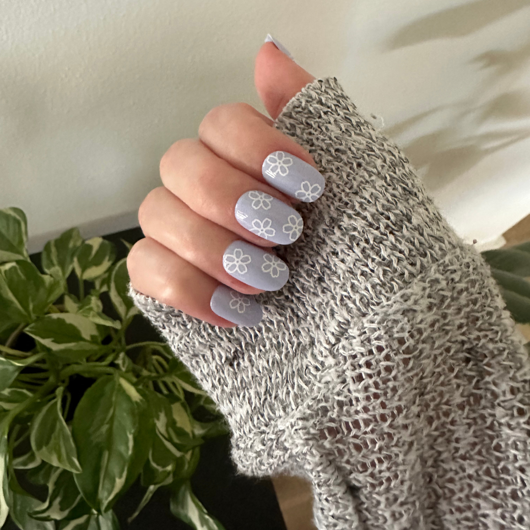 A light blue mani accented by white flower doodles.
