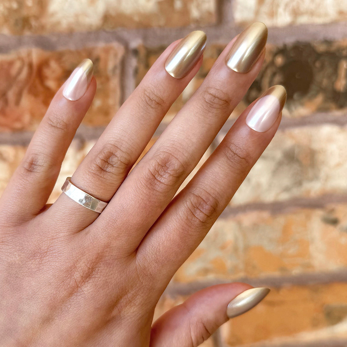A mani set of solid glimmering gold and golden french tips in a medium oval shape.