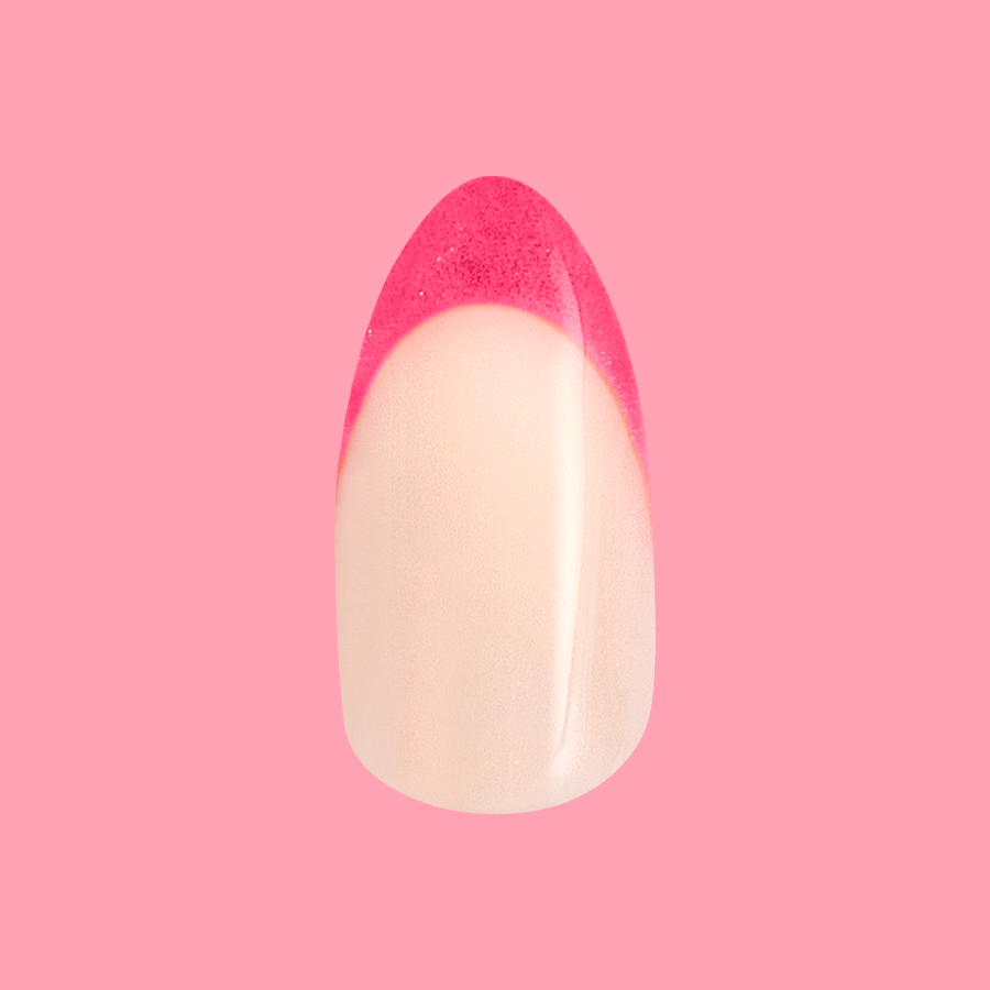 A neon pink french tip mani with a shimmering velvet effect in a medium almond shape.