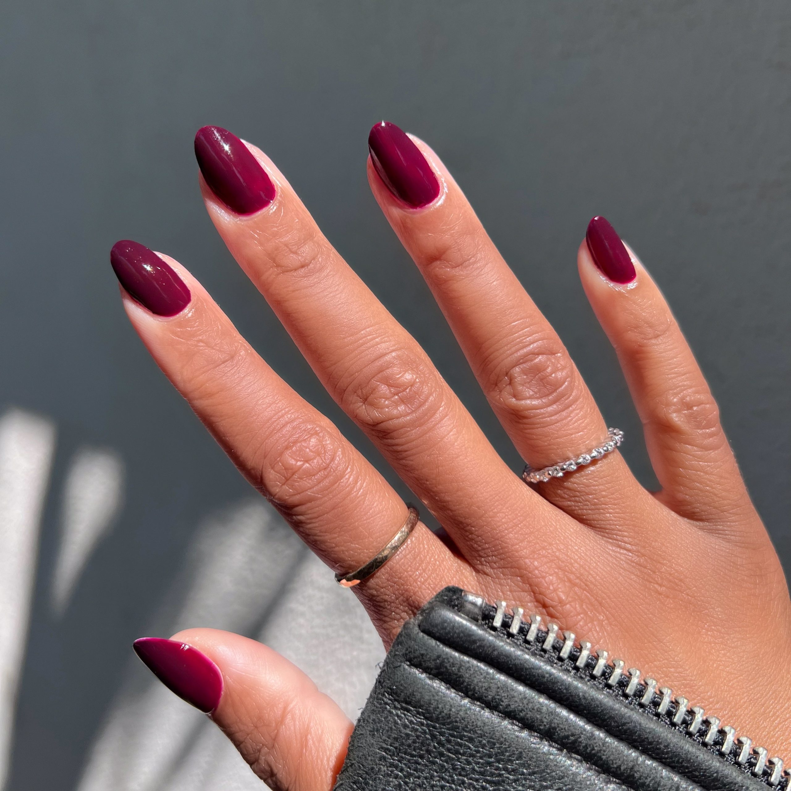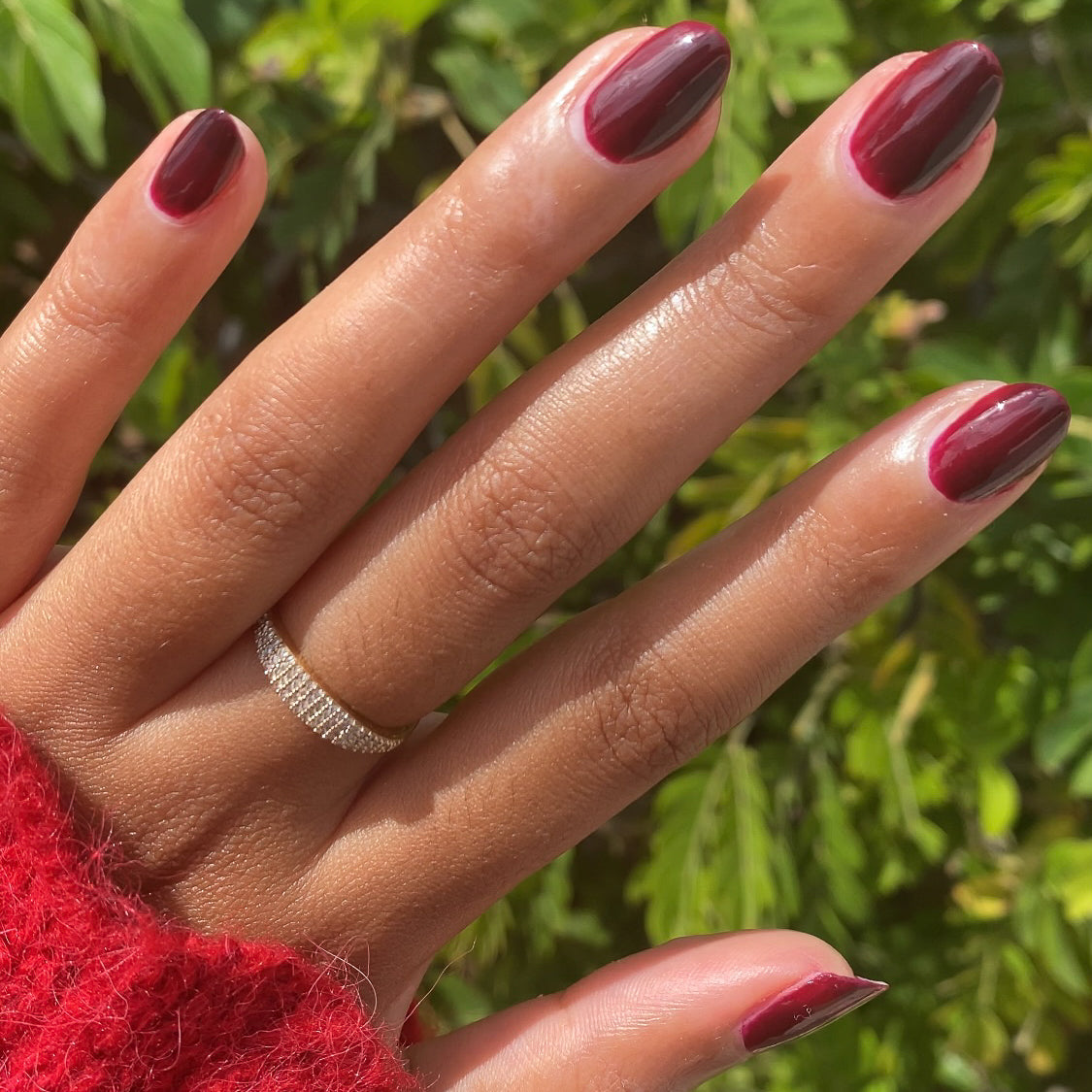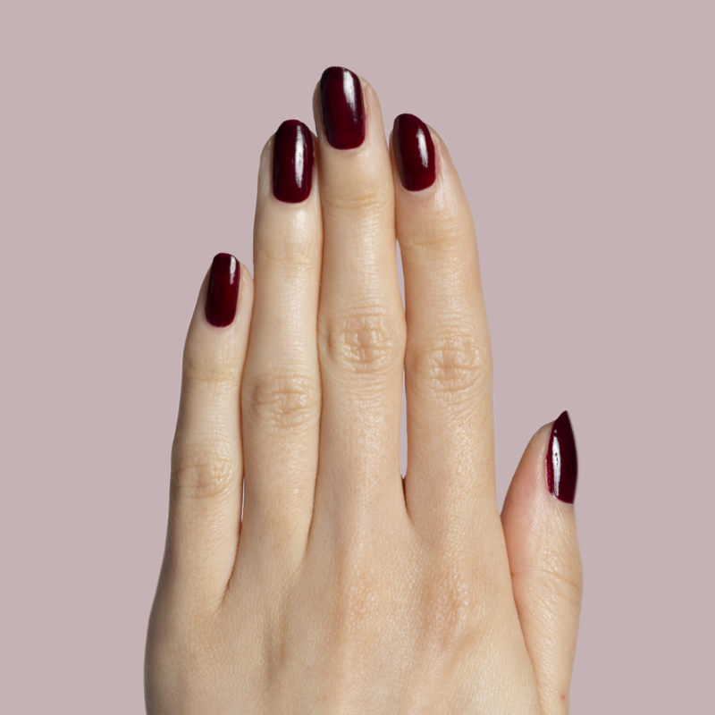 A crimson jelly sheer for perfectly patent leather looking nails.