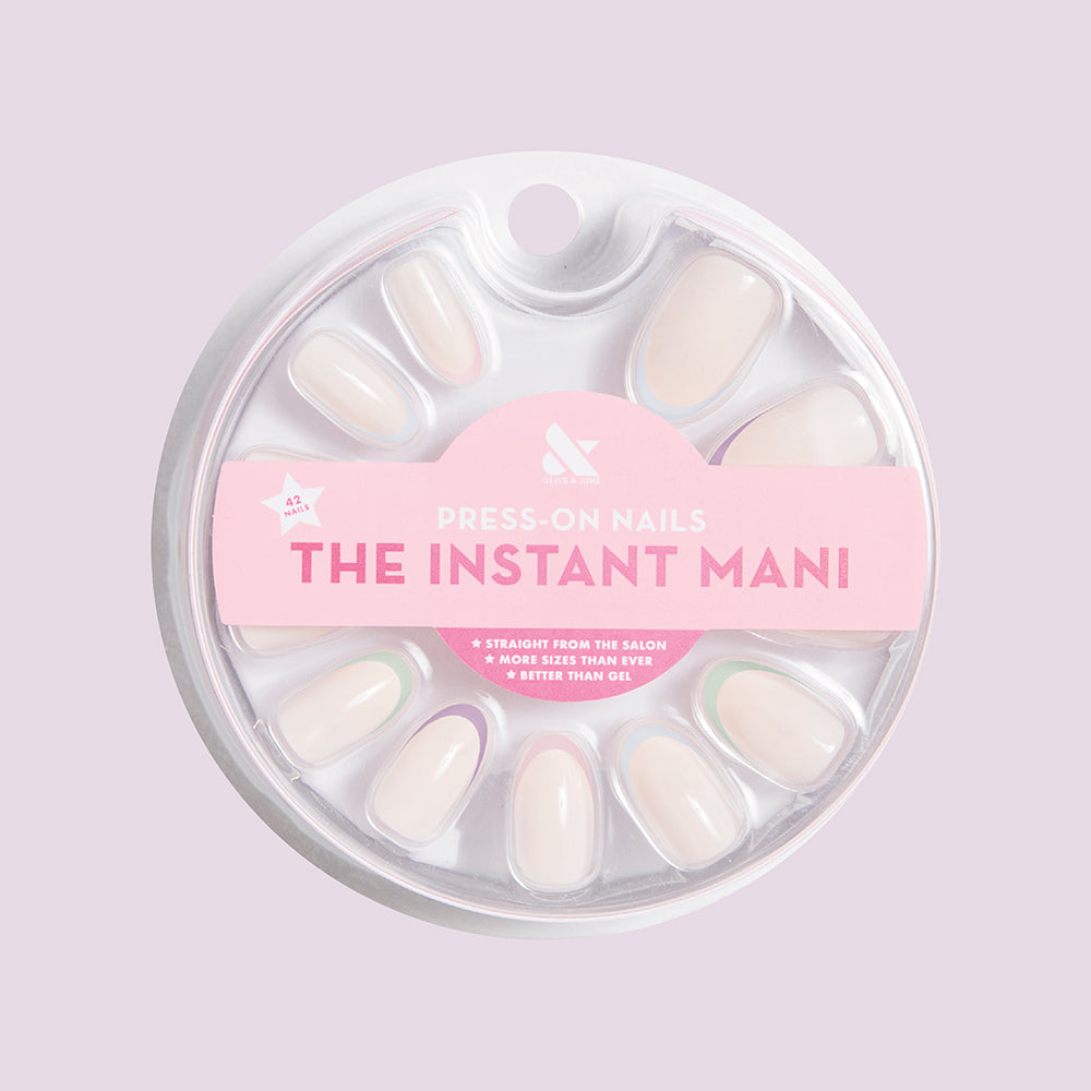 A subtle pastel French mani on a milky white base in a medium oval shape.
