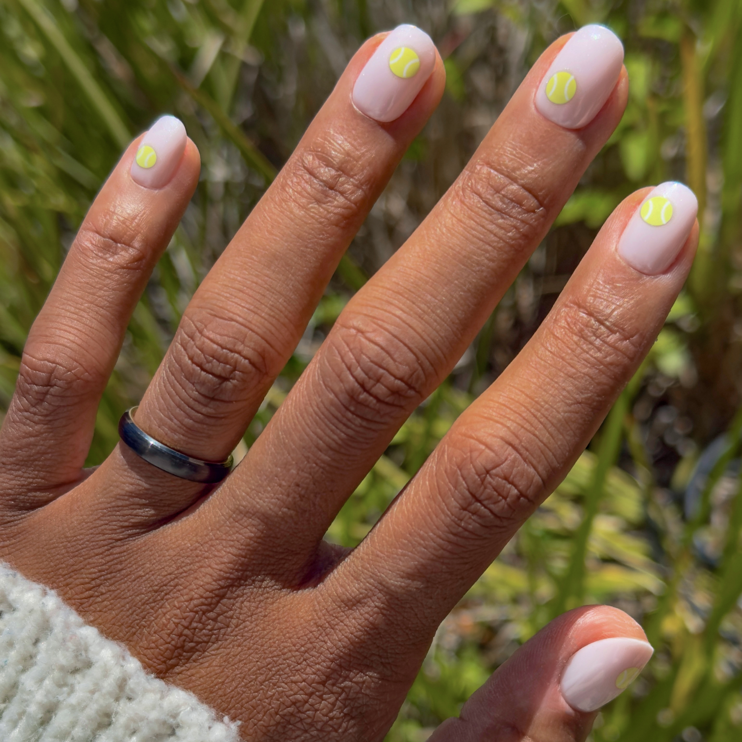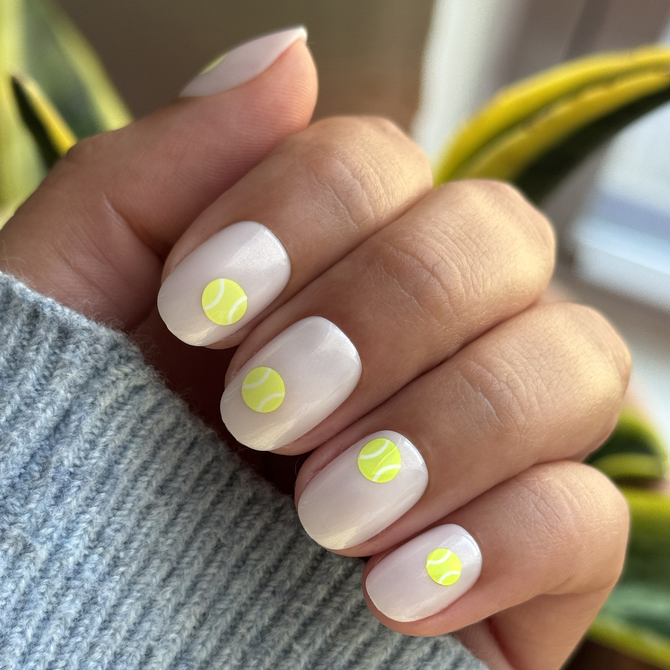 A neutral sheer mani with bright yellow-green tennis balls in an extra short squoval shape.
