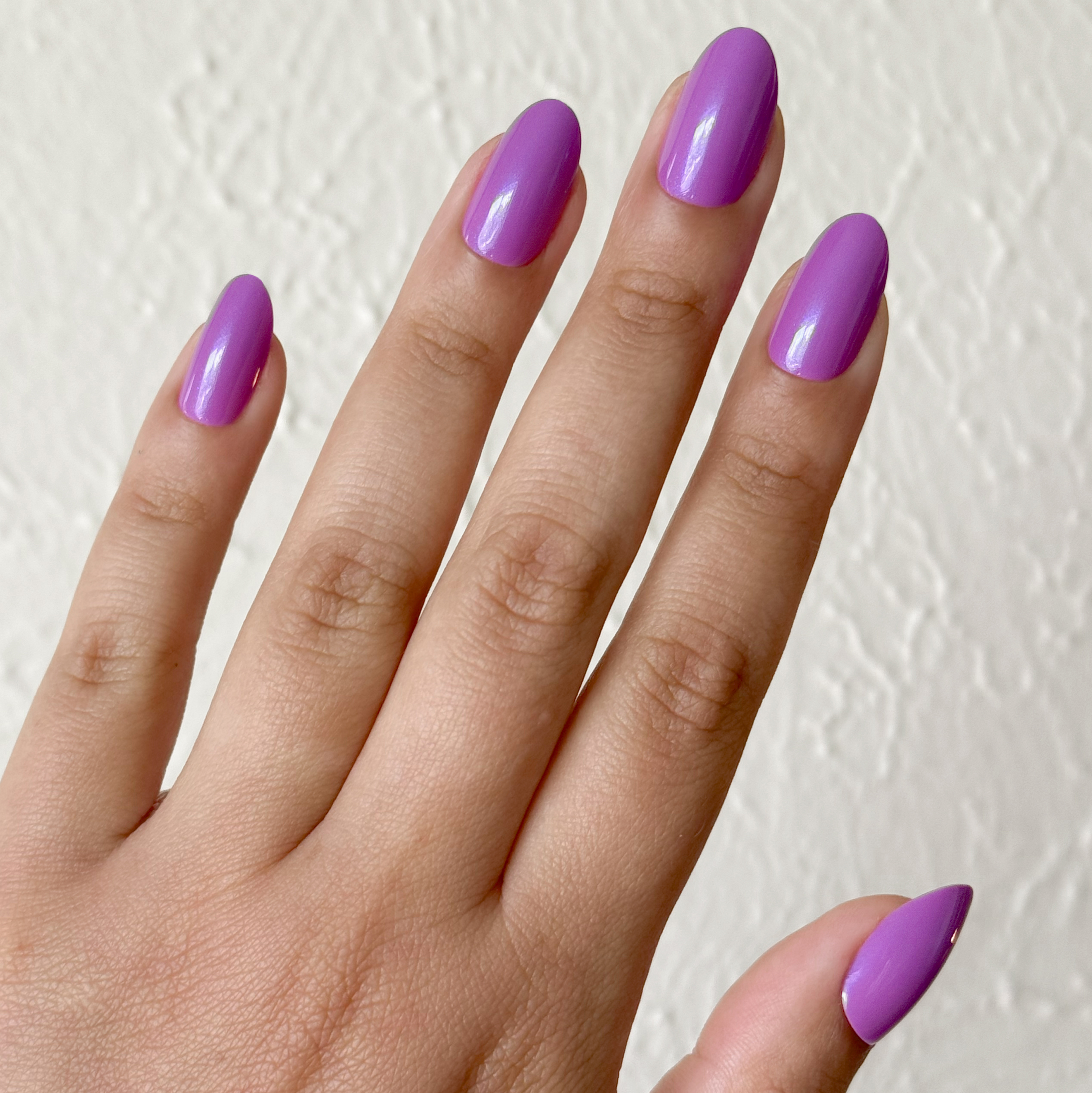 A shimmering pinky purple mani in a medium oval shape.