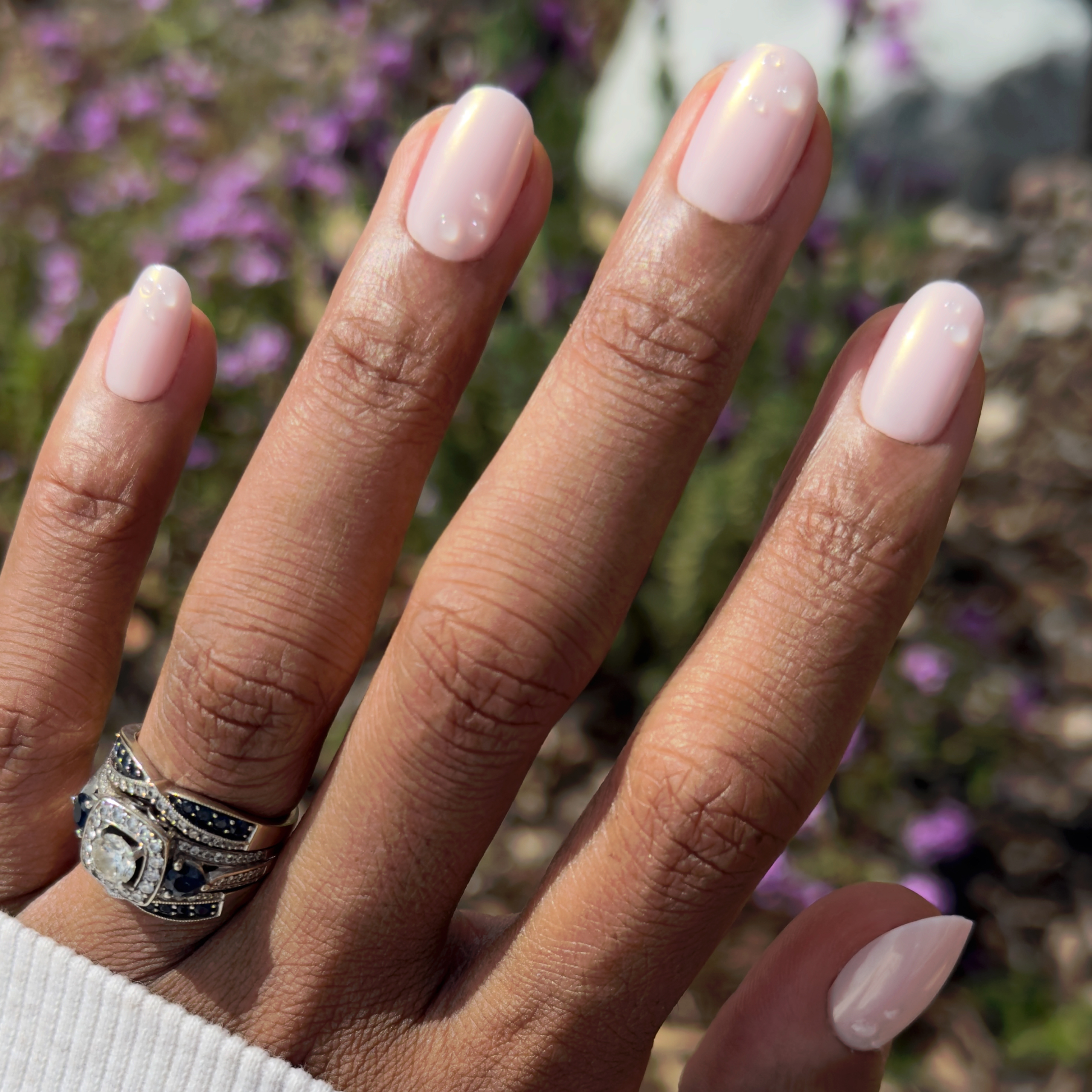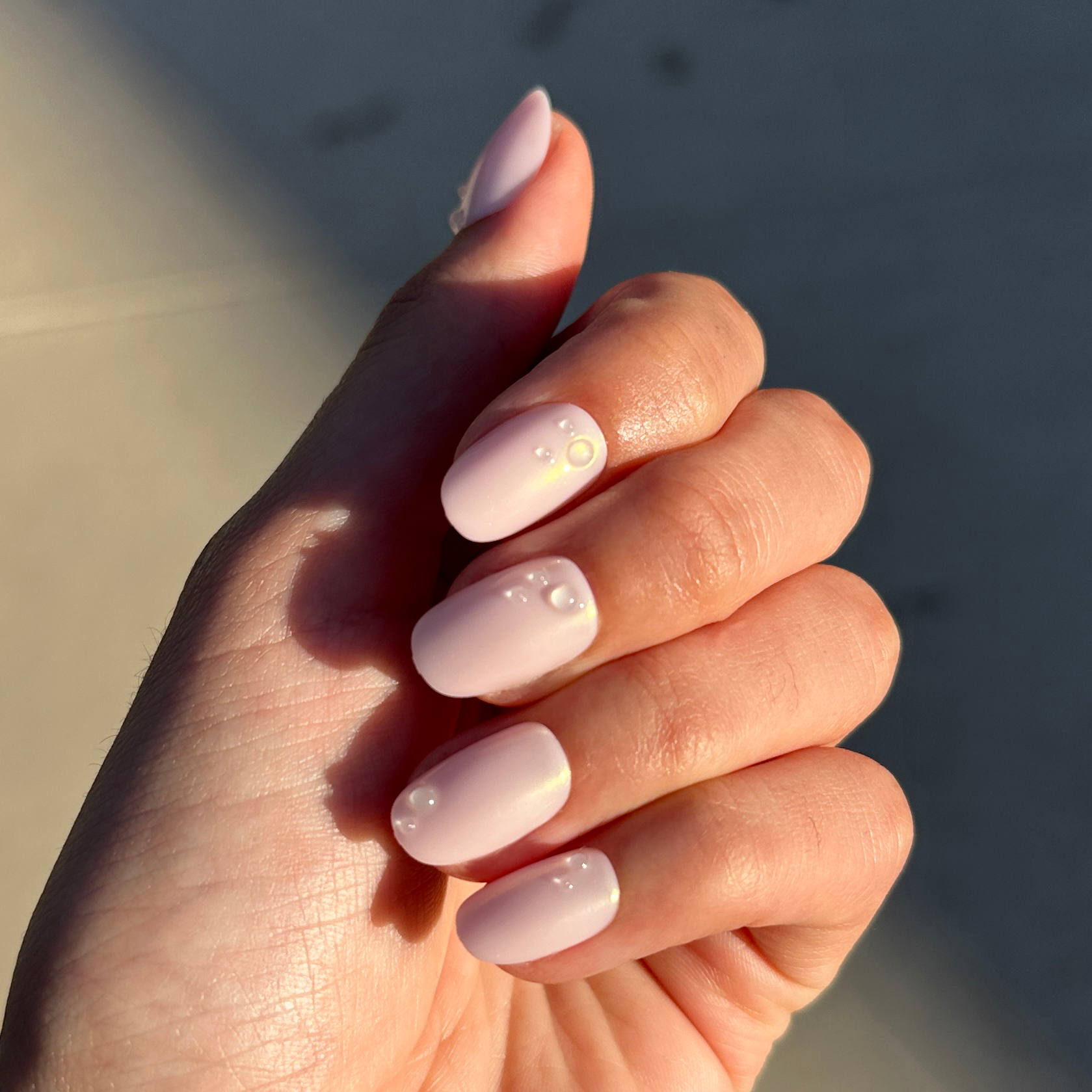 A shimmery pink iridescent mani topped with tiny bubbles in a short round shape.