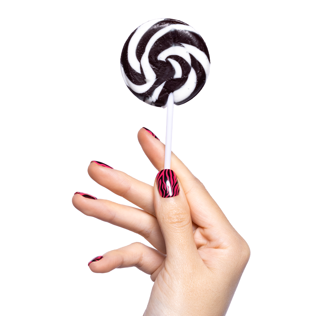 A hot pink zebra print mani in an extra short squoval shape.