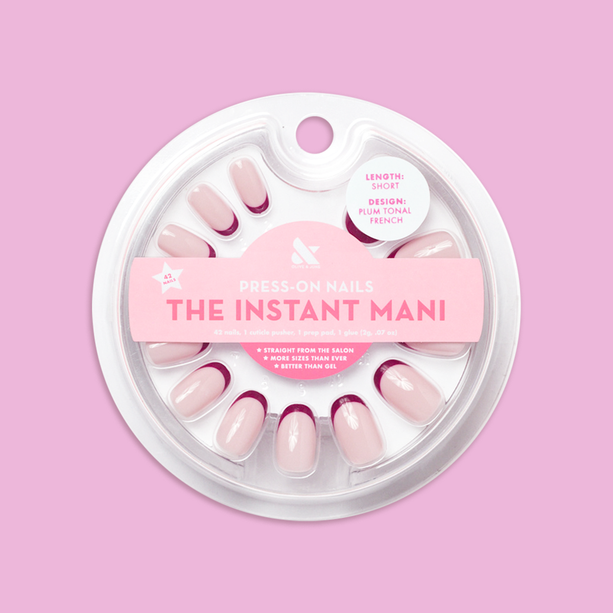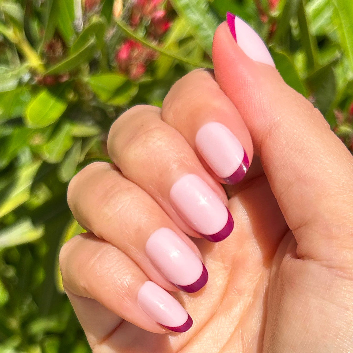 A plum french tip on a neutral pink base in a short round shape.