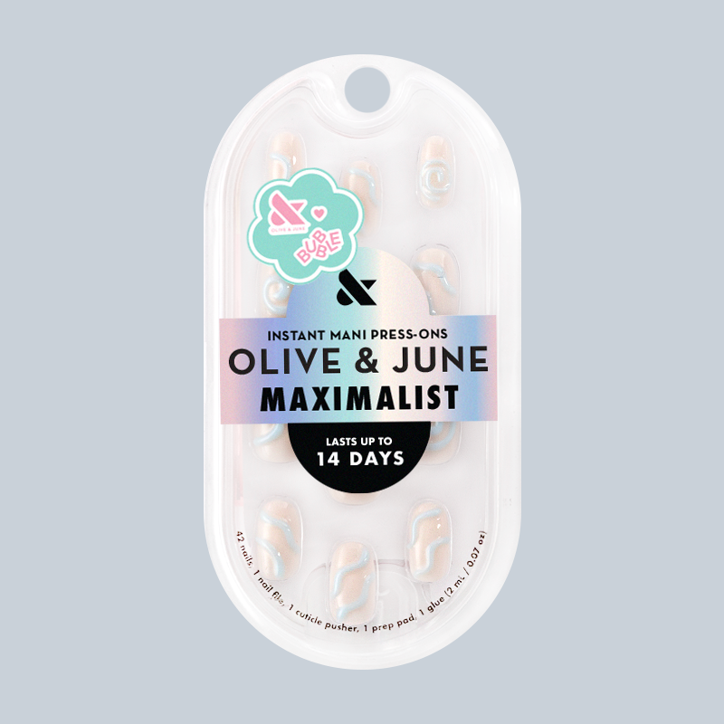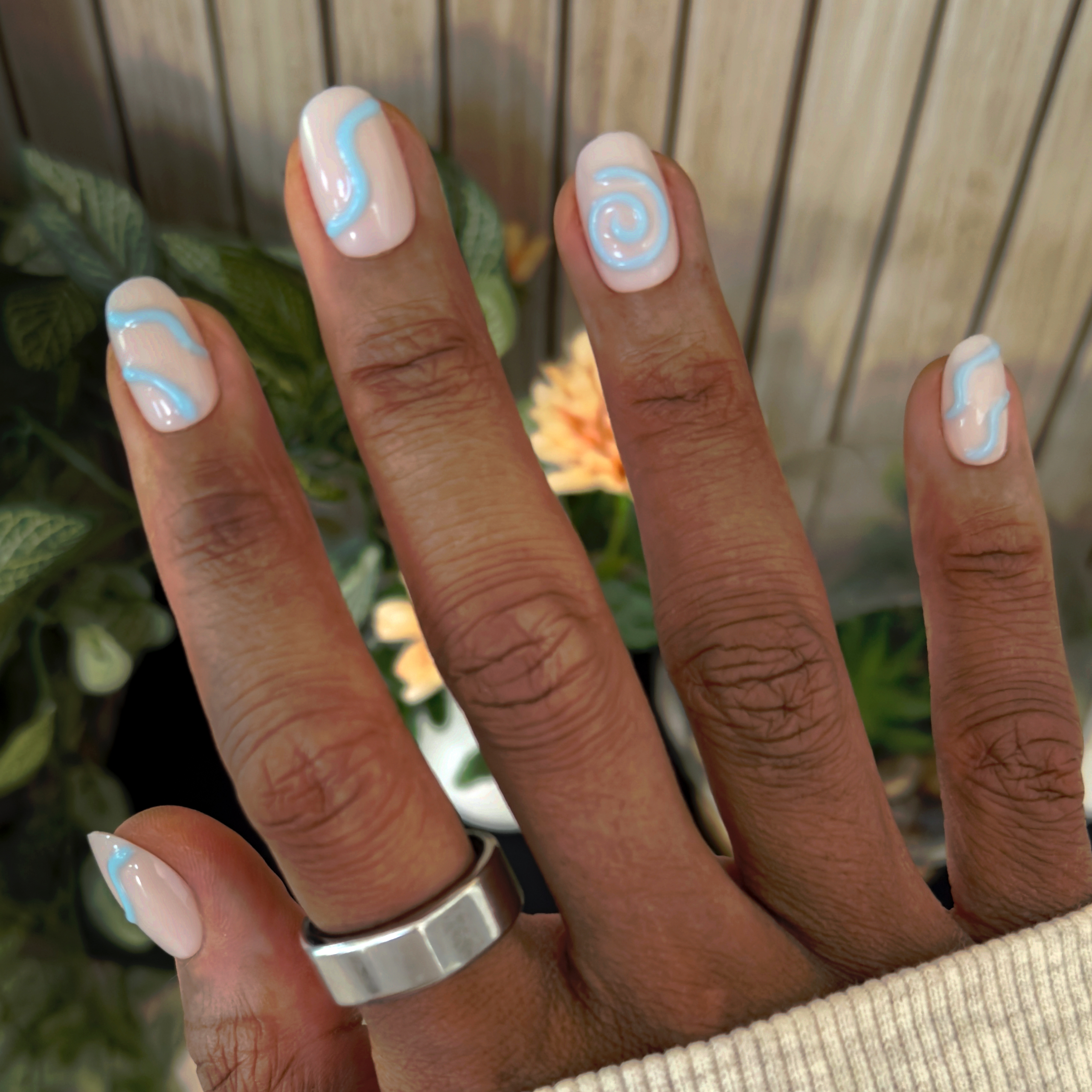 A neutral mani topped with puffy squiggles and swirls in a short round shape.