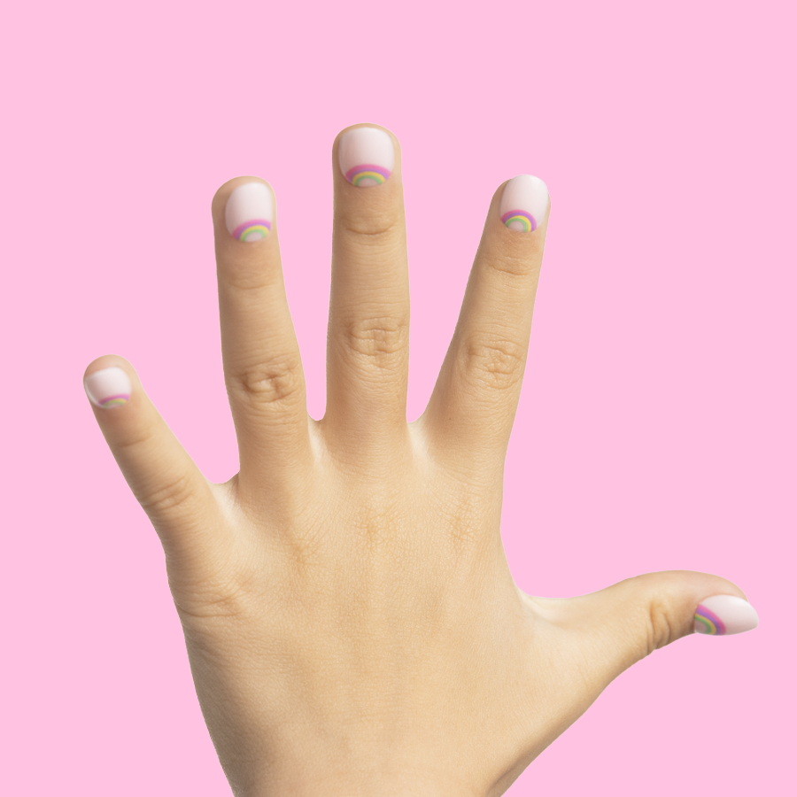Somewhere over the rainbow is this perfect pastel pink mani with the cutest little rainbows placed at your fingertips. Pot of gold not included!