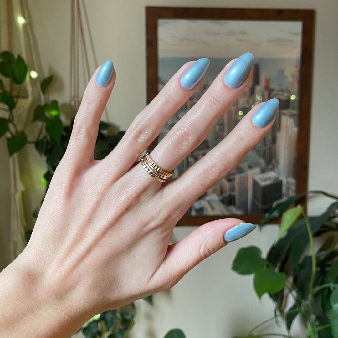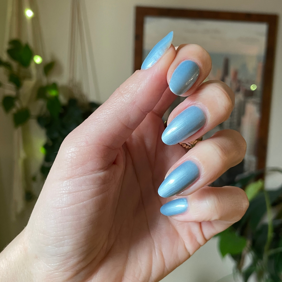 A shimmery sheer blue polish you’ll want to revisit again and again.