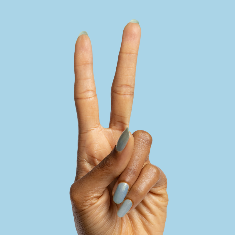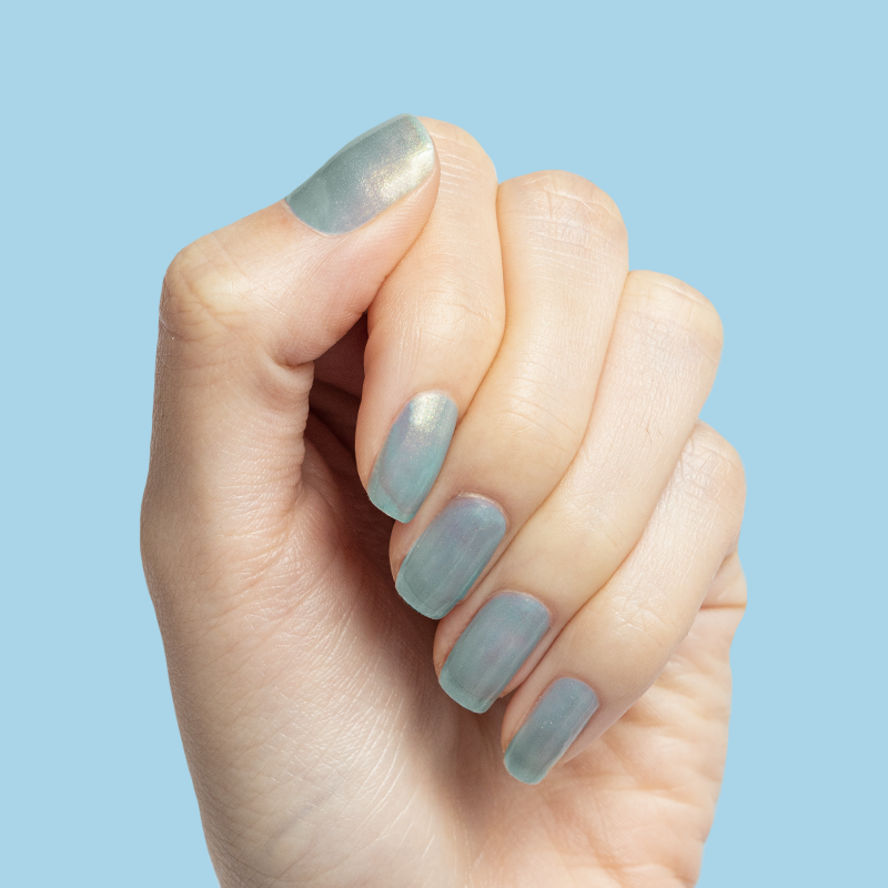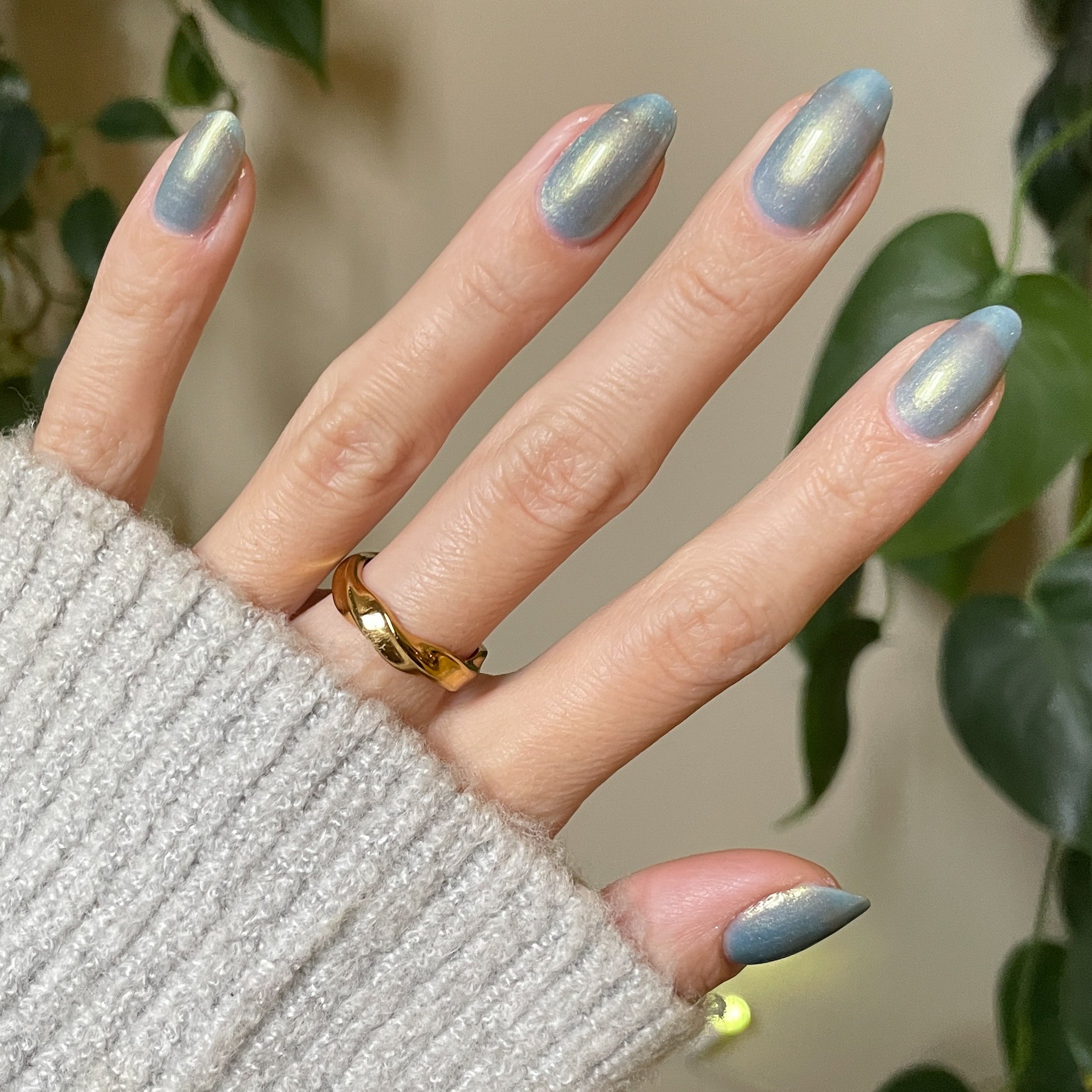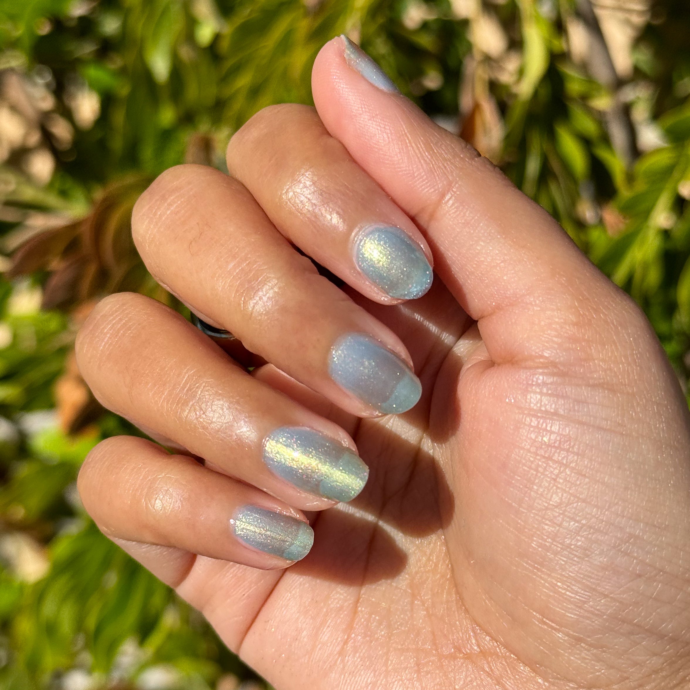 A shimmery and sheer blue iridescent polish that wants to make every mani shine like a sequin.