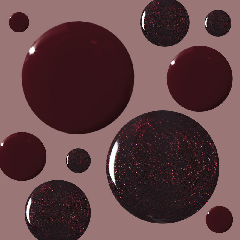 A shimmery oxblood mani with a — you guessed it — shiny patent finish.