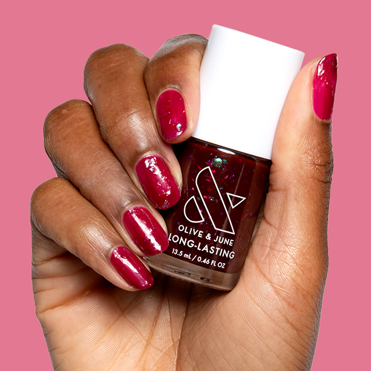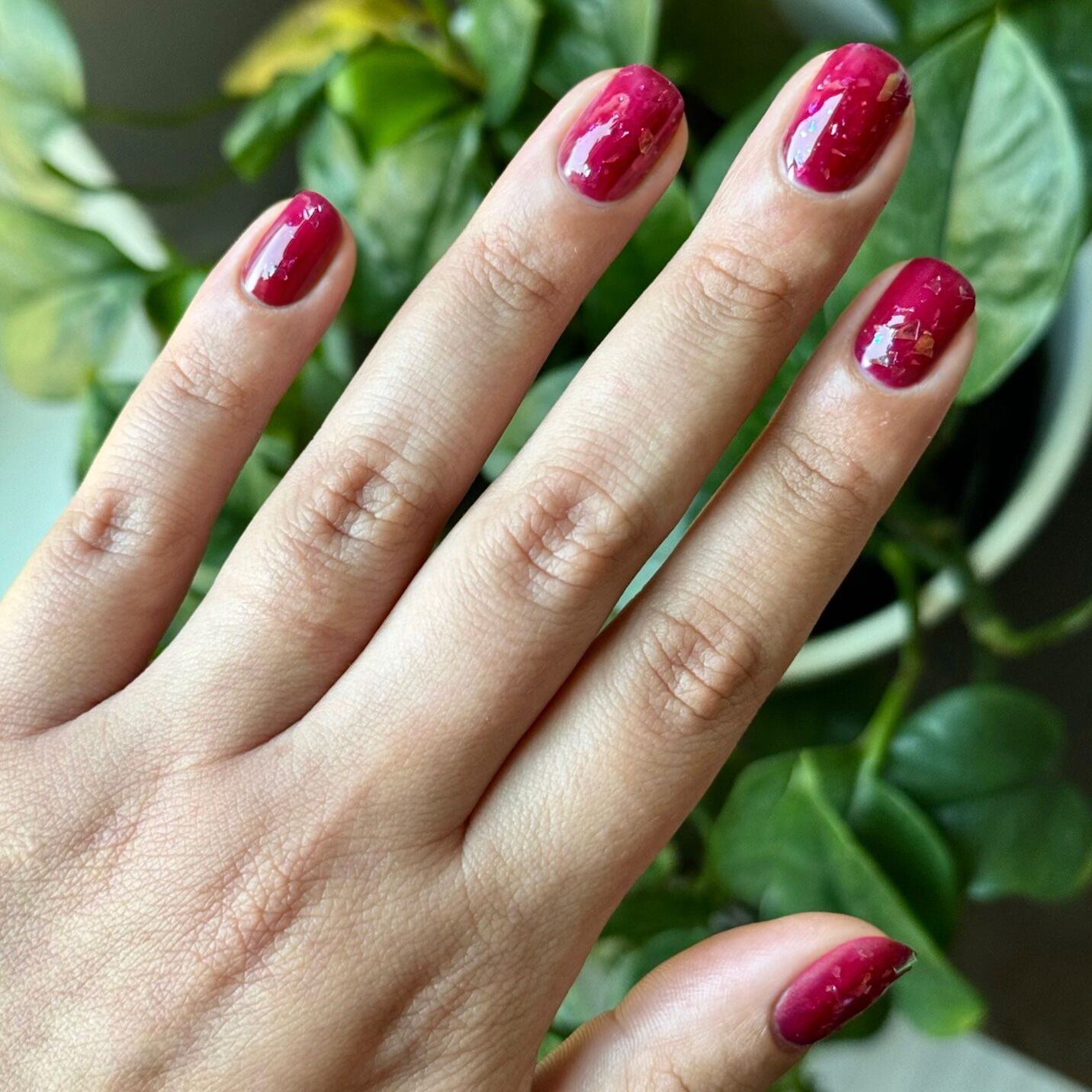 A cabernet jelly shade packed with holographic flakes with infinite mani potential.