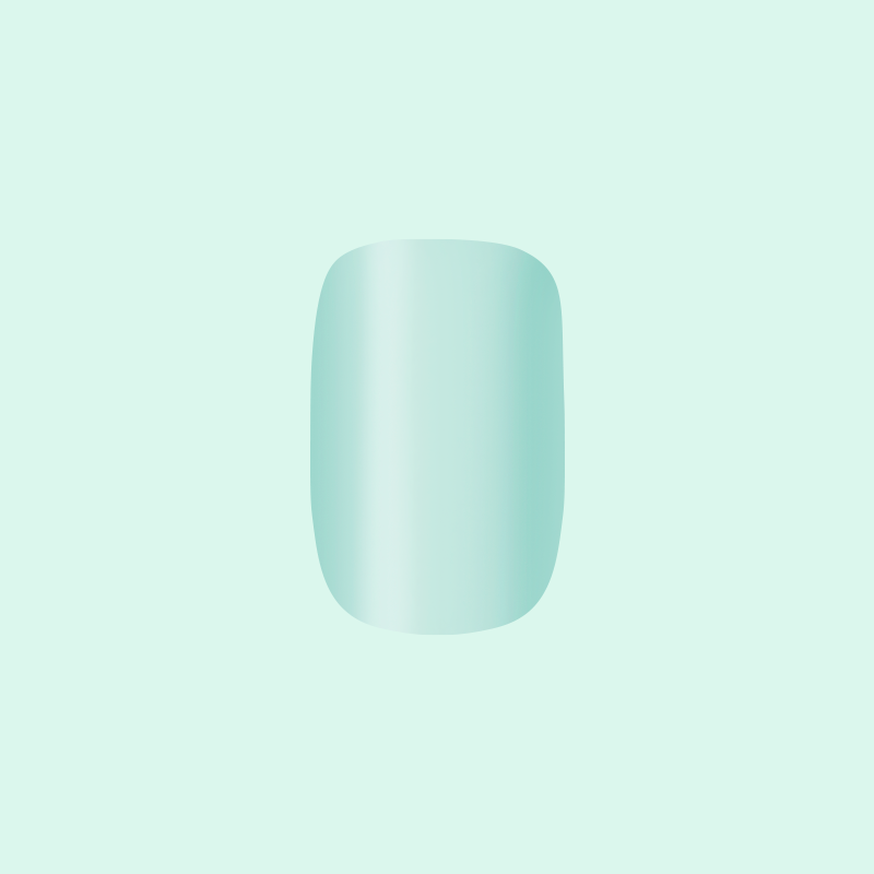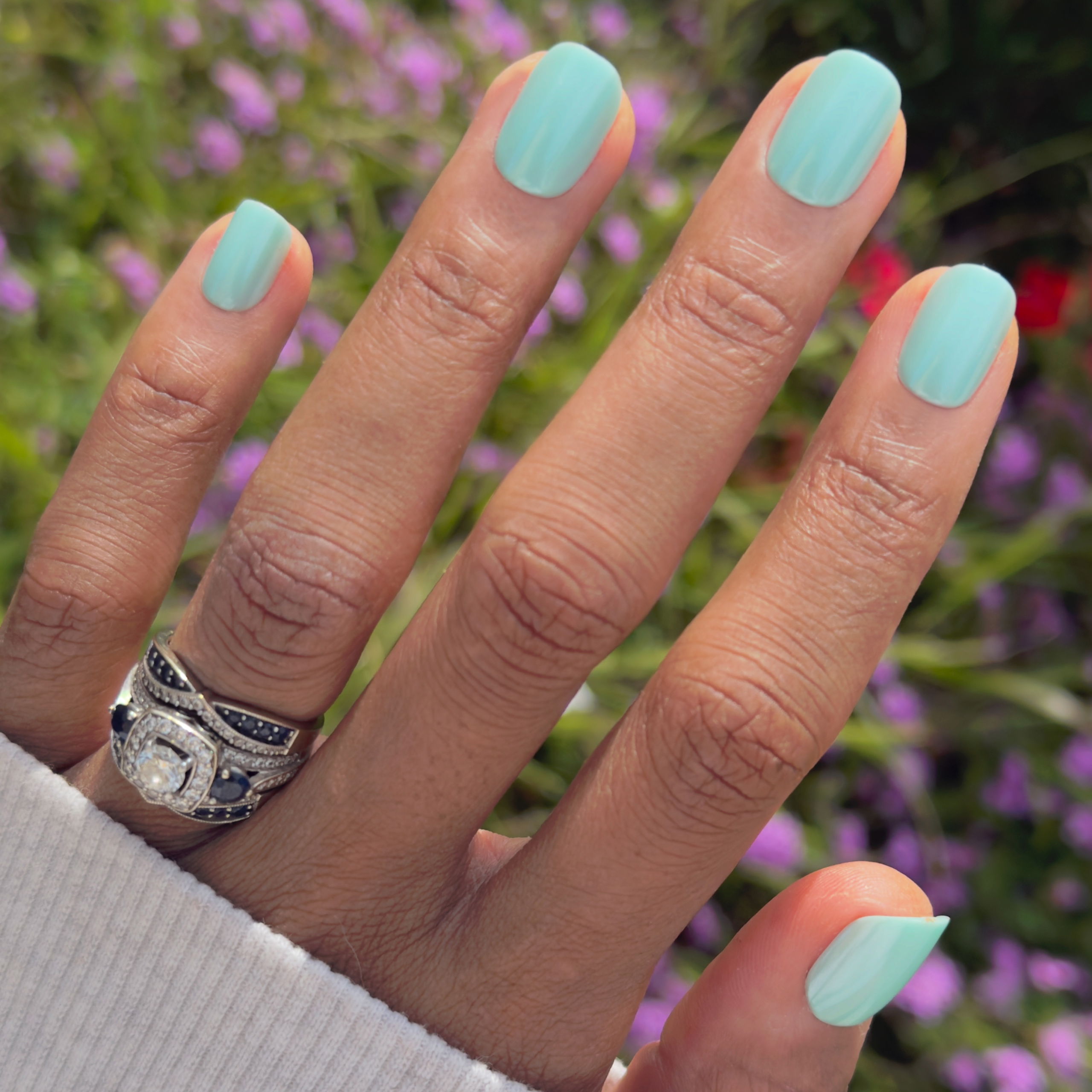 A bright turquoise mani topped with soft shimmery chrome in an extra short squoval shape.