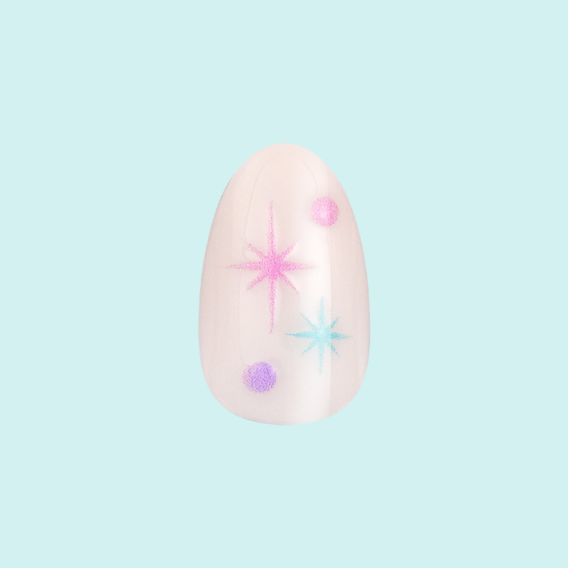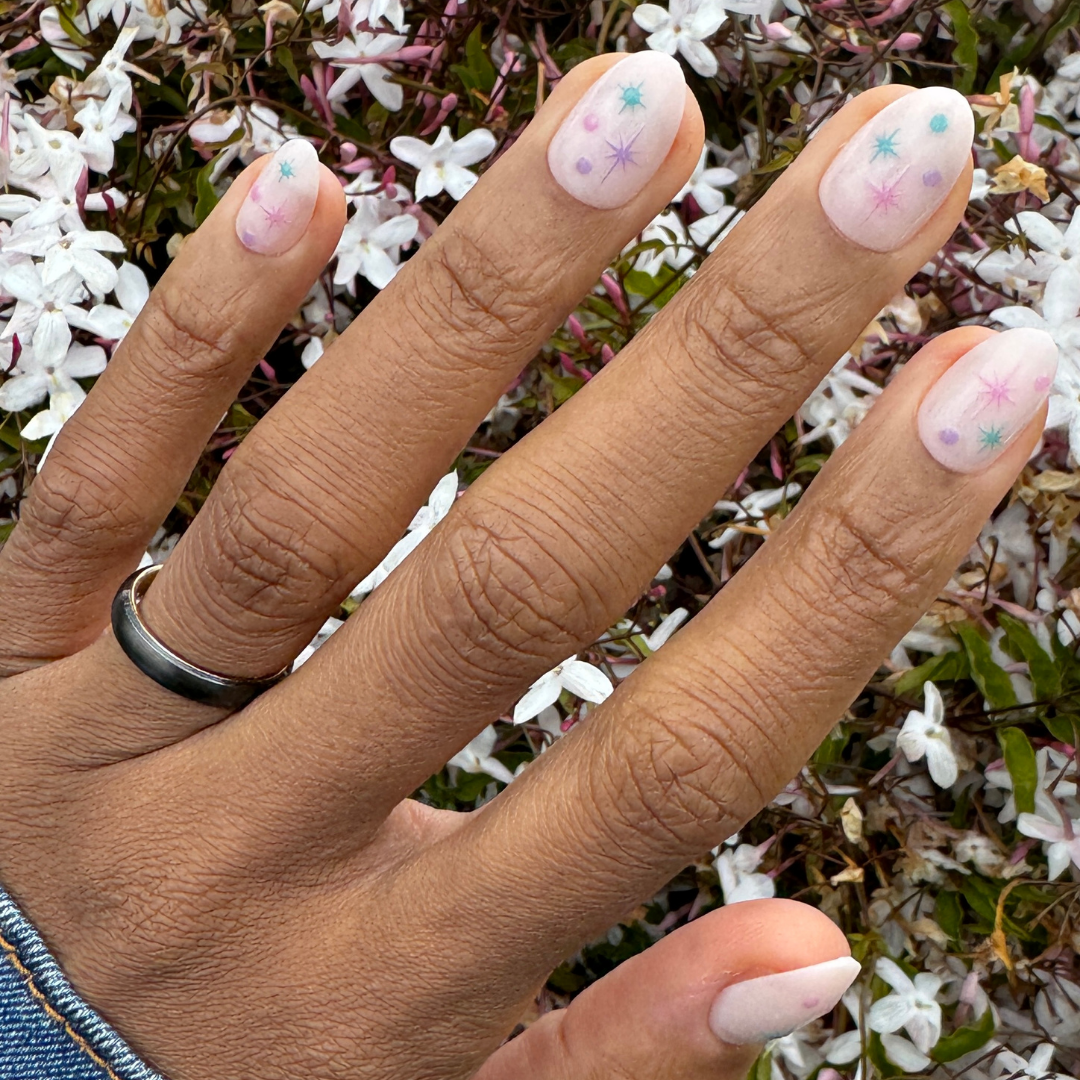 A sheer neutral mani with candy-colored sparkles in a short almond shape.