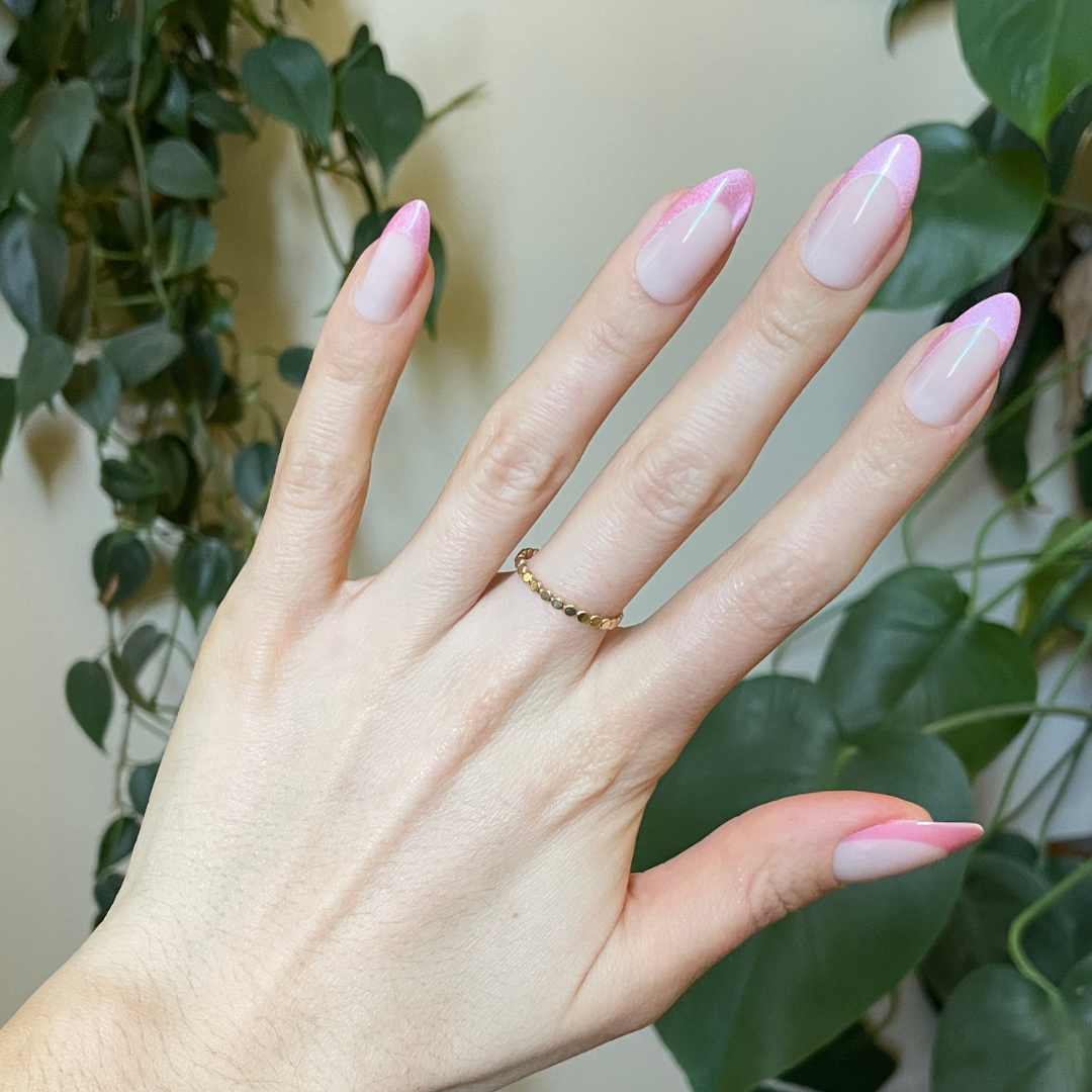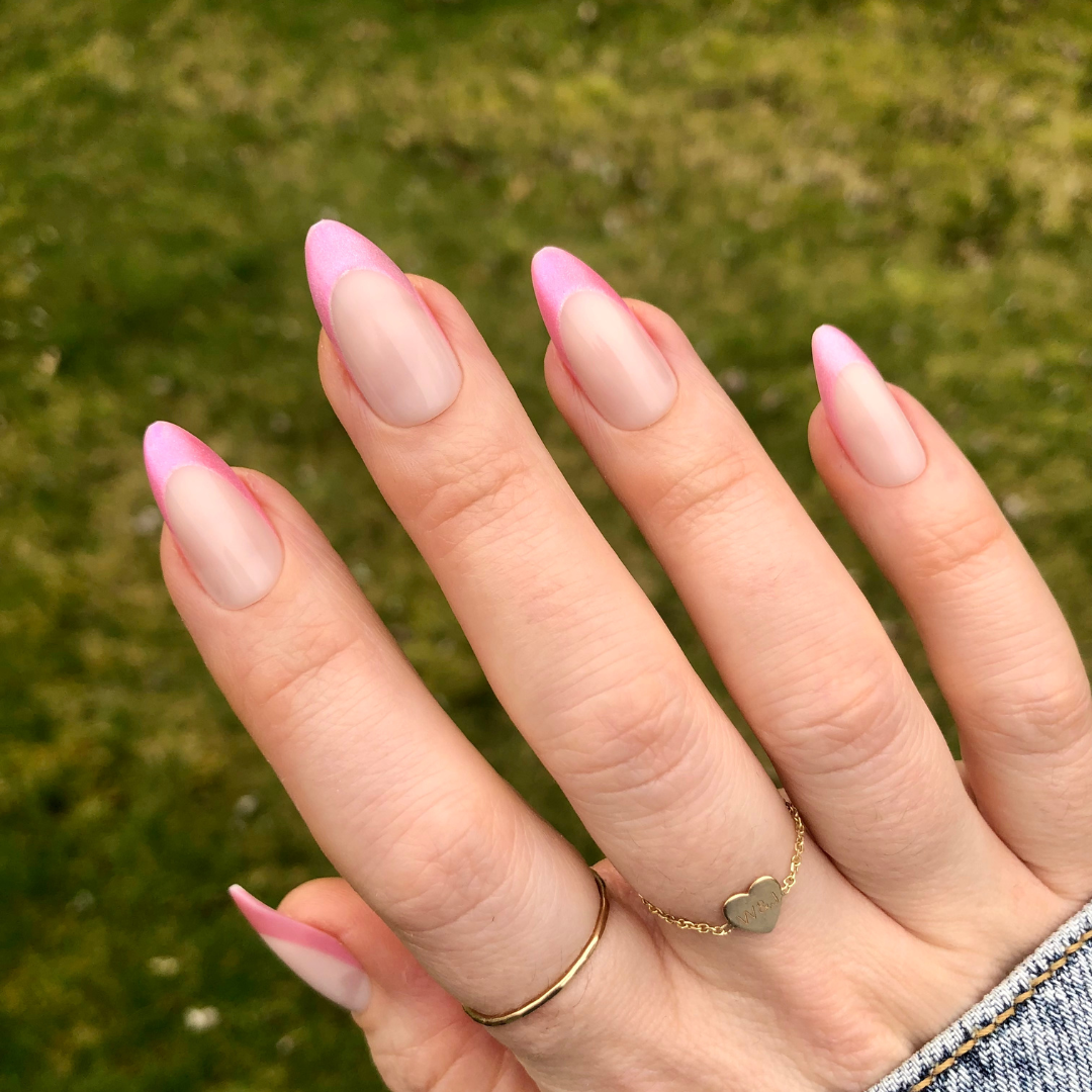 A neutral mani with a velvet-effect French tip in a long almond shape.
