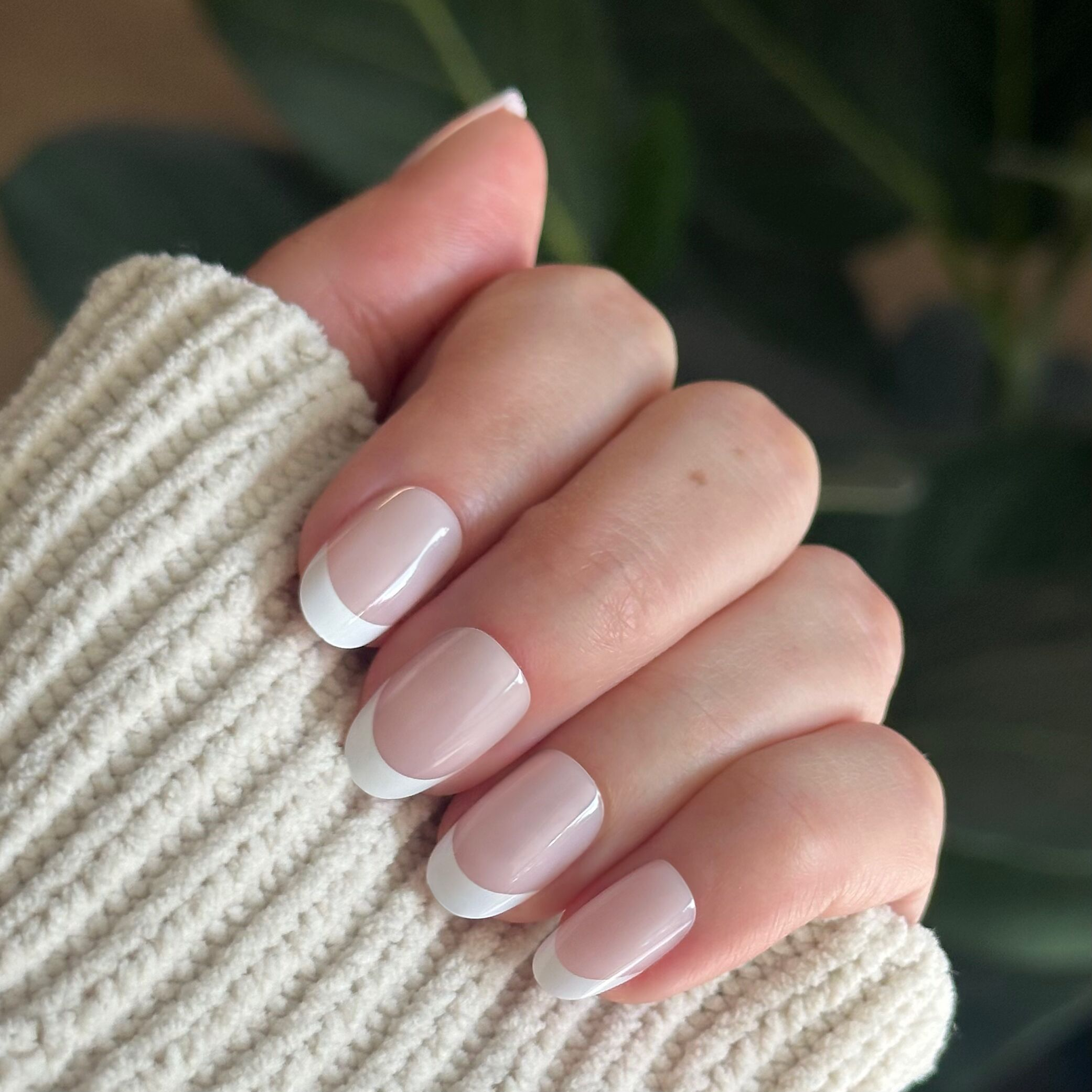 A sheer neutral base with a diffused milky white tip french mani in a short round shape.