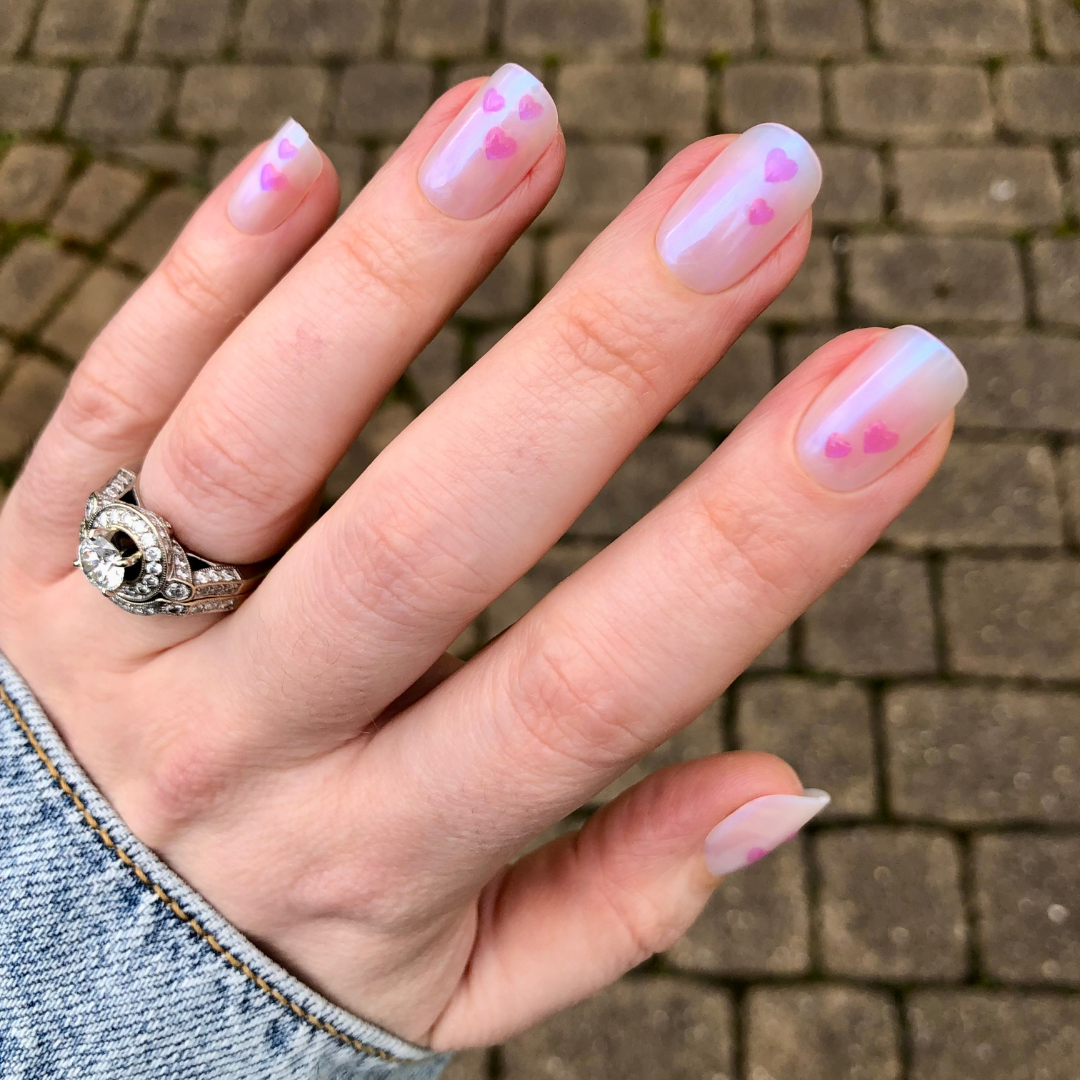 A shimmery iridescent base with puffy pink hearts in a short squoval shape.