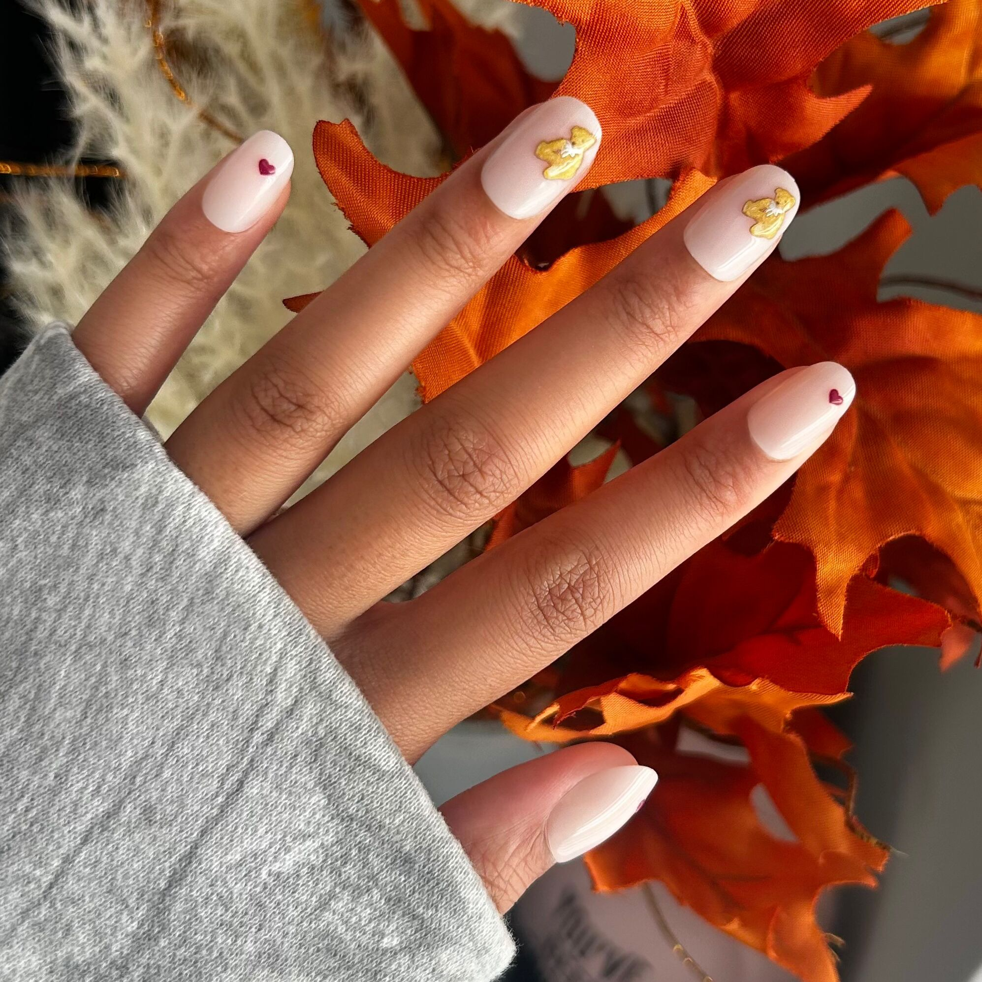 A pinky-beige mani accented by tiny teddy bears and vampy hearts in a short round shape.