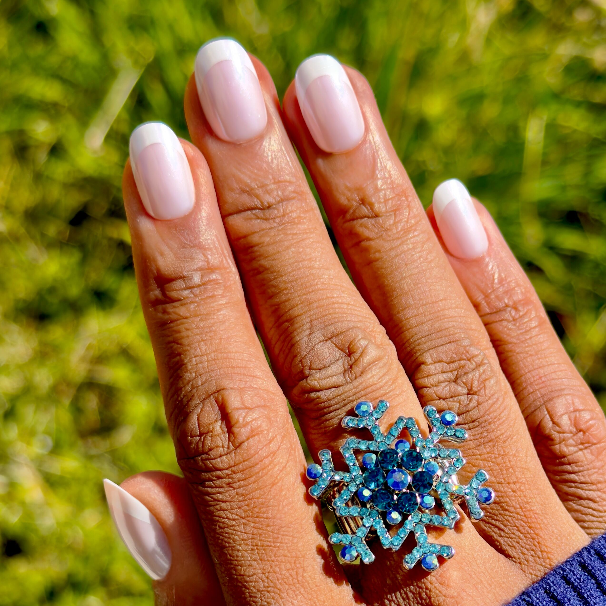 A classic french mani topped with shimmering chrome in a short round shape.